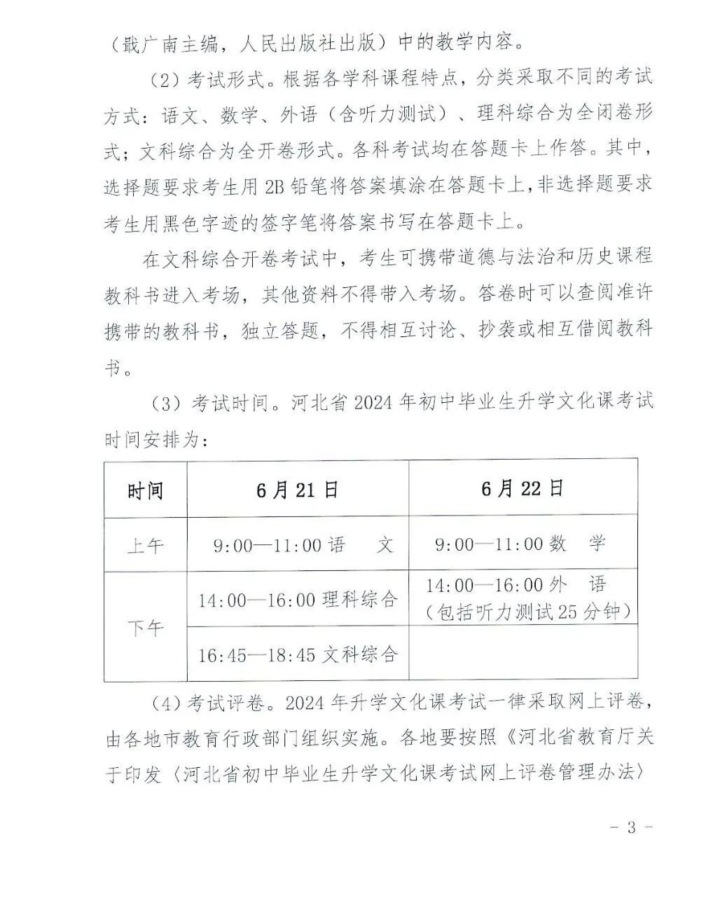 日前,河北省教育厅发布关于做好2024年初中毕业与升学考试工作的通知,通知明确,总分为650分,与去年相比,增加了20分,主要是体育由30分加到了50分,其中过程性考核20分,现场测试30分。文化课总分不变依然是600分,包括语文、数学、外语、理综(包括物理、化学两门学科)、文综(包括道德与法治、历史两门学科)各120分,考试时间安排在6月21日、22日,体育测试于2024年5月底前进行。