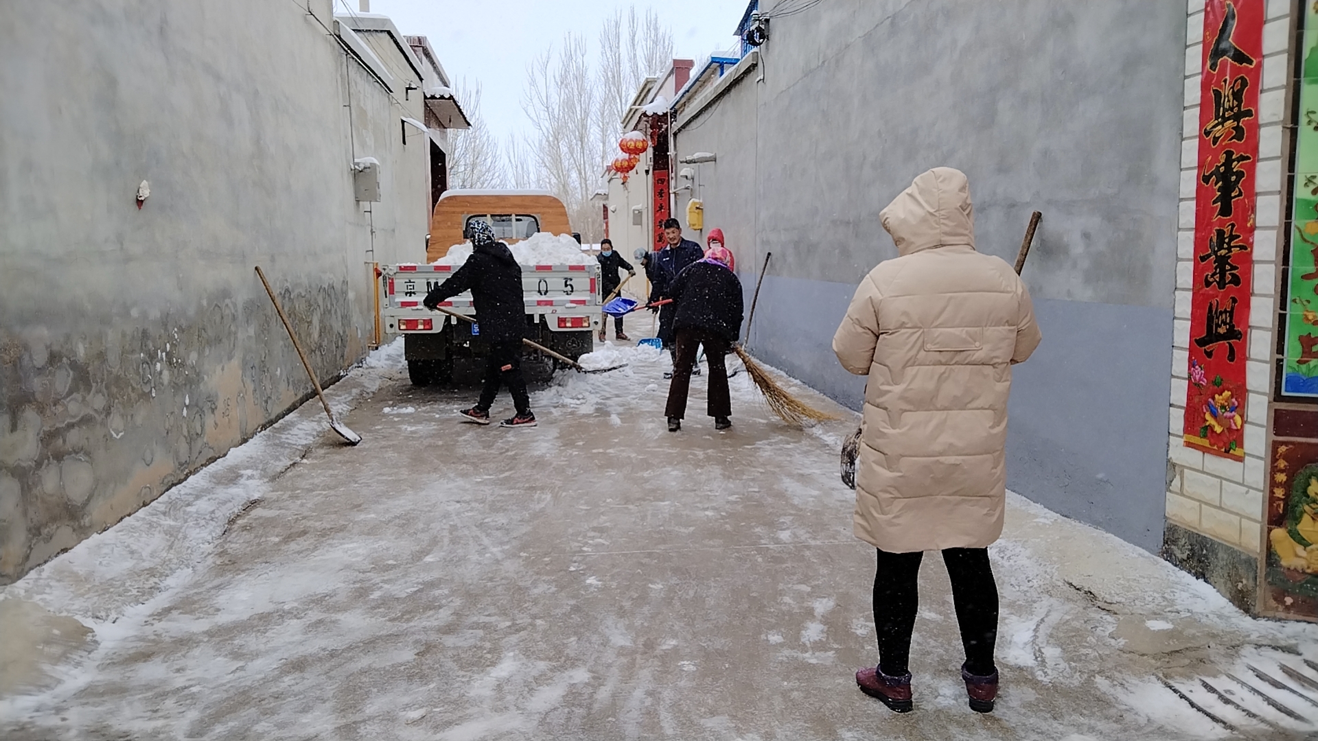 清扫积雪现场,镇村干部、党员群众、村民不畏严寒,采取“机械+人工”、“清扫+融雪”的作业方式,对镇村主干街道、通村道路及巷道等区域积雪进行全覆盖式清扫,全力营造畅通的出行环境,切实消除道路通行安全隐患。与此同时,各村两委成员组织人员优先为村里行动不便群众门口进行清扫除冰,保证他们出行安全,得到基层群众赞扬和好评。