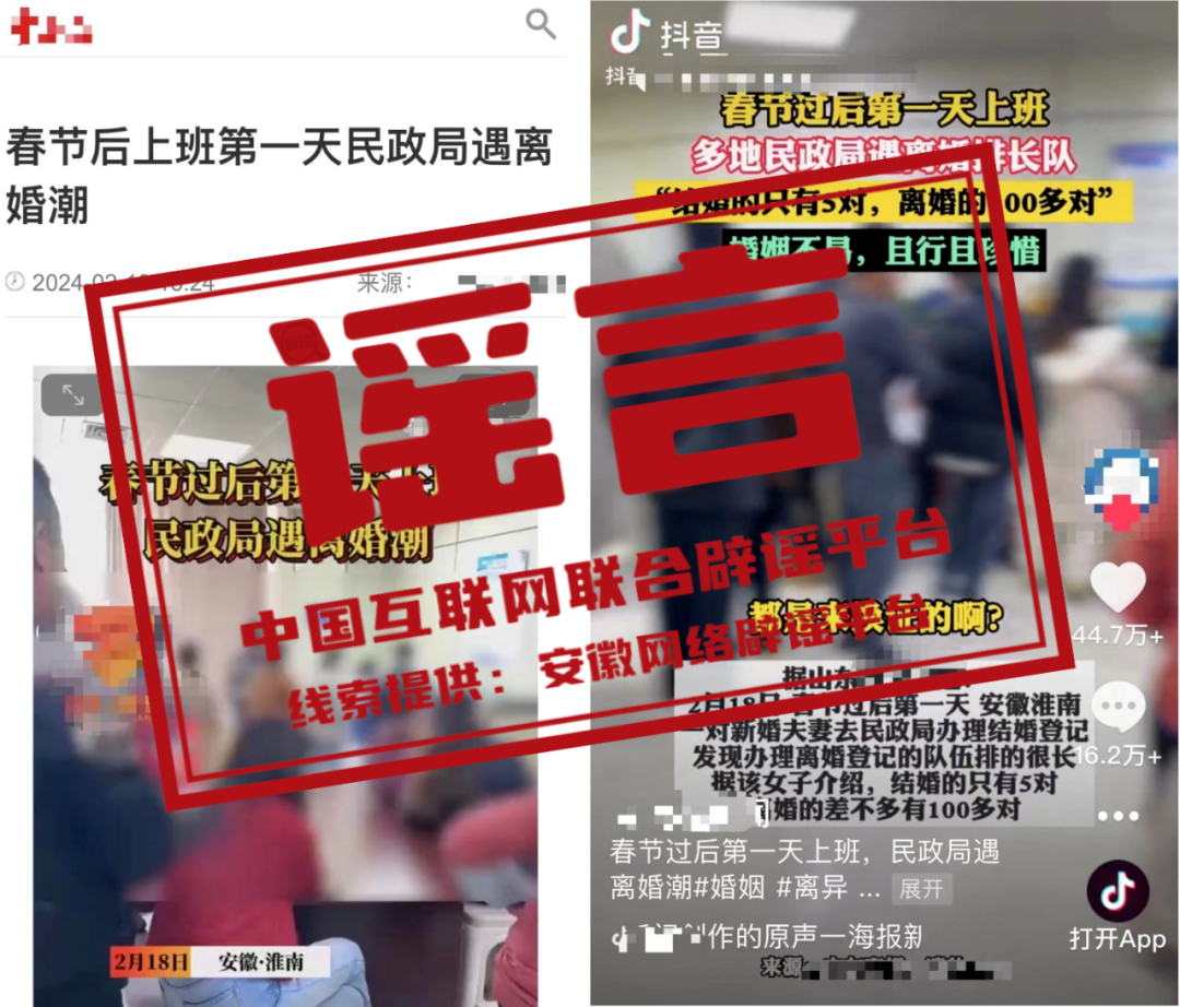 真相:近日,网络上流传关于“安徽淮南春节后上班第一天民政局遇离婚潮”的视频,引发关注。经核实,此短视频是王某到安徽淮南寿县政务服务中心办理结婚登记,在复印材料和拍照的文印室拍摄了一段多人排队的视频,配文称“开年第一天离婚的比结婚的多”,编造谣言在短视频平台发布,公安机关依法对王某予以行政处罚。(来源:安徽网络辟谣平台)