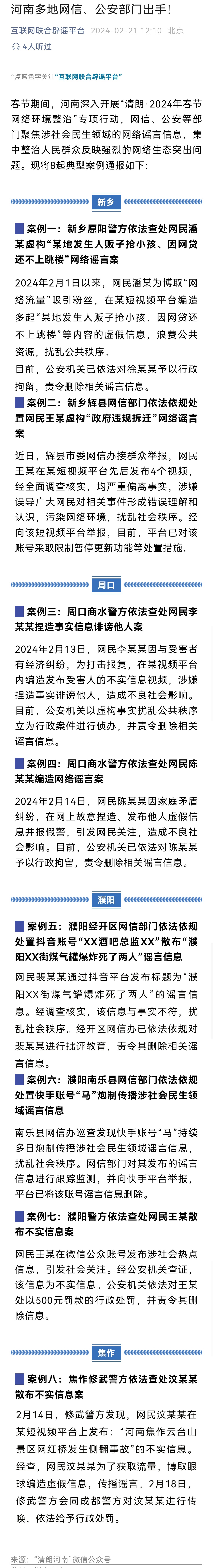 通报:河南网信、公安部门公布打击整治网络谣言8起典型案例