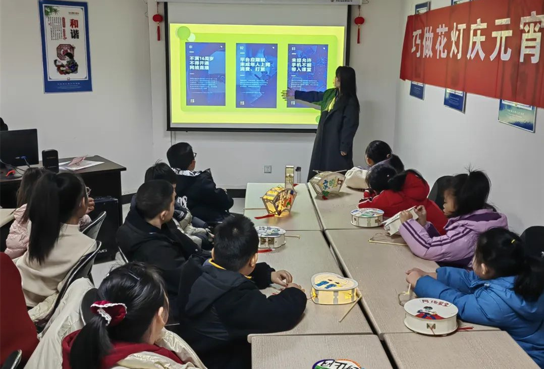 活动现场,网络文明志愿者以互动问答的形式详细讲解了预防网络沉迷、远离网络不良信息等知识。孩子们围绕文明上网、远离网络谣言、网络防沉迷等主题进行花灯创作,将网络文明元素融入元宵节民俗文化中。