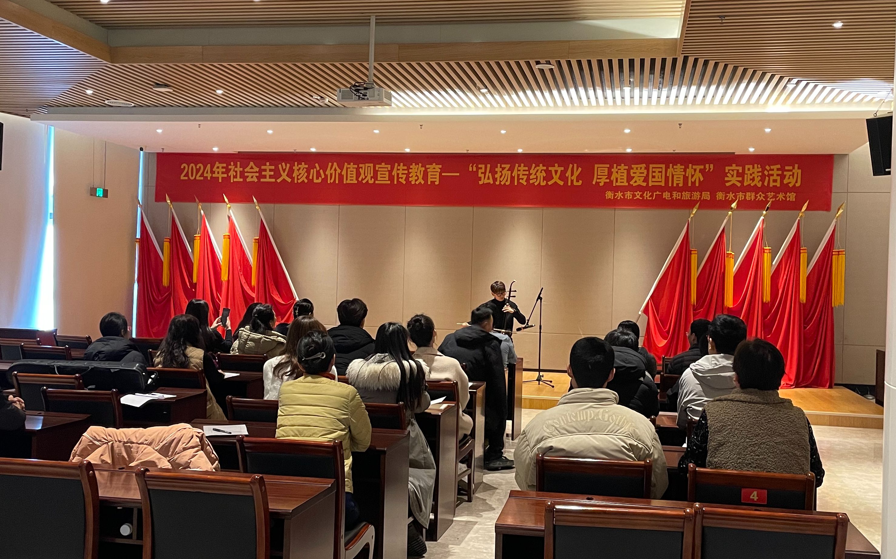 为深入学习贯彻党的二十大精神,用传统文化涵养群众深厚的爱国情感,2月7日,由衡水市文化广电和旅游局主办,衡水市群众艺术馆承办的社会主义核心价值观宣传教育——“弘扬传统文化 厚植爱国情怀”二胡实践活动在市文化艺术中心二楼市民大讲堂举行。