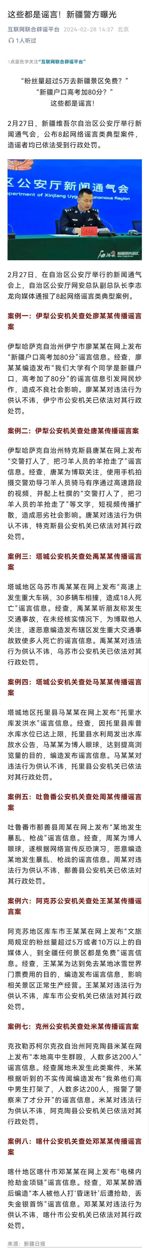 详情:2月27日,新疆维吾尔自治区公安厅举行新闻通气会,公布8起网络谣言类典型案件,造谣者均已依法受到行政处罚。案例一:伊犁公安机关查处廖某某传播谣言案案例二:伊犁公安机关查处唐某传播谣言案案例三:塔城公安机关查处禹某某传播谣言案案例四:塔城公安机关查处马某某传播谣言案案例五:吐鲁番公安机关查处周某传播谣言案案例六:阿克苏公安机关查处王某某传播谣言案案例七:克州公安机关查处米某传播谣言案案例八:喀什公安机关查处邓某某传播谣言案网络空间是公共场所,不是法外之地,公安机关提醒广大网民自觉遵守法律法规,不编造、传播未经证实的信息,共同维护健康有序的网络环境。同时欢迎广大网民积极举报网络谣言等违法犯罪线索与网上违法违规行为,携手共建清朗网络家园。(来源:新疆日报)