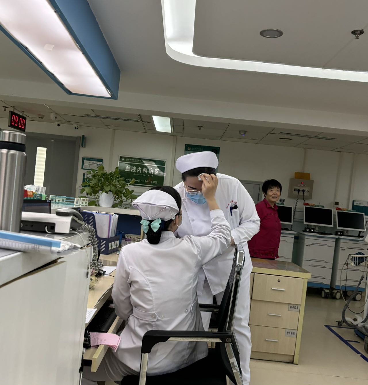 哈院血液内科是衡水市医学重点发展学科,众多的住院患者让医护人员春节以来的工作量增加了至少五倍。图为血液内科护士于倩倩为累得满头大汗的赵勃珠擦去额头的汗水,大家互相激励,共同服务好患者。
