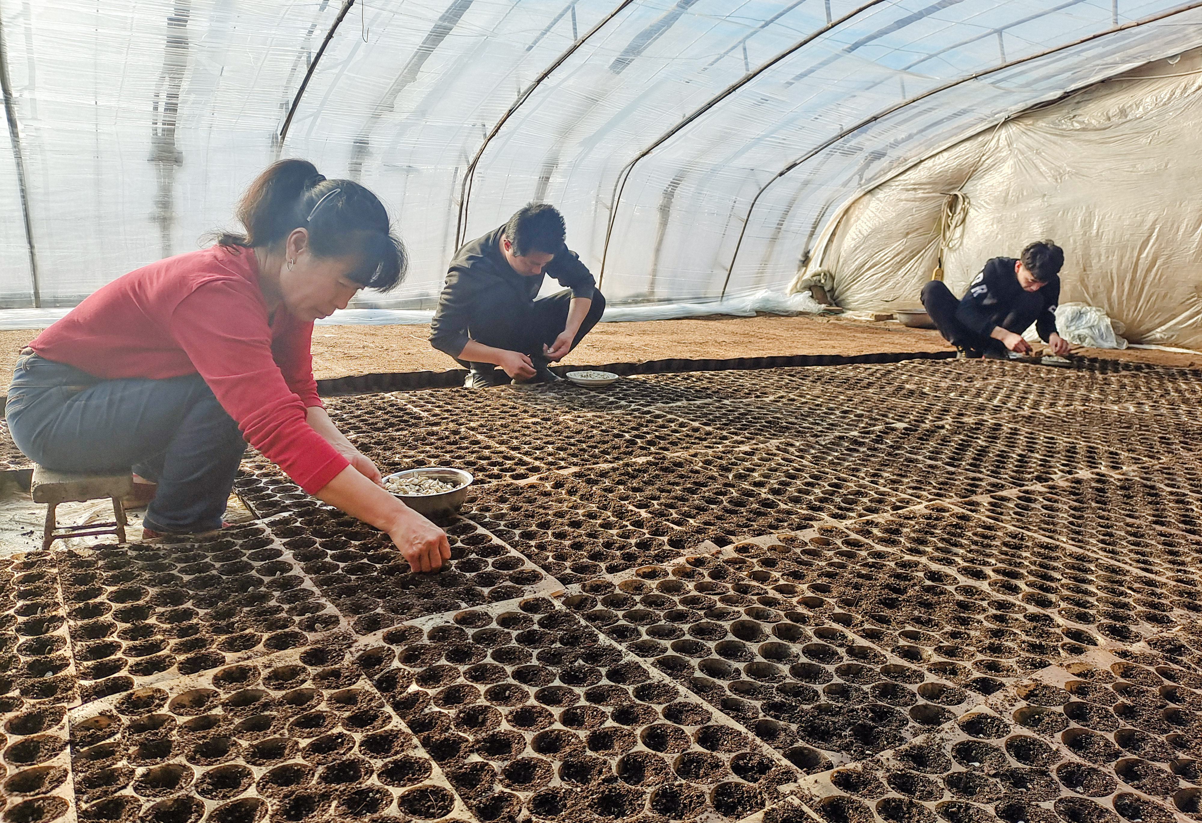 在阜城漫河西瓜种植基地,工人正在育苗。