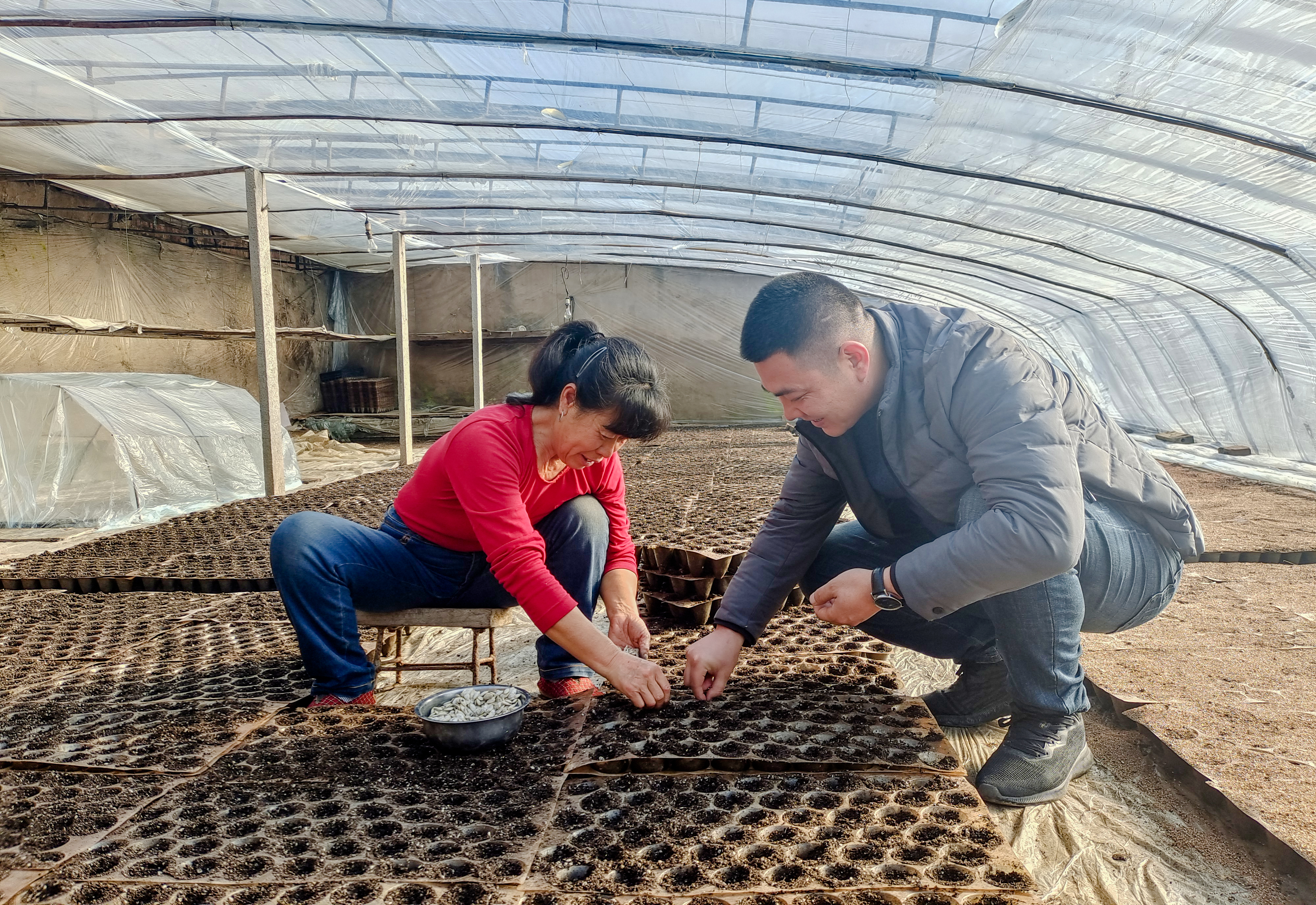在阜城漫河西瓜种植基地,气象服务专家孙双全正在帮助西瓜种植大户育苗。