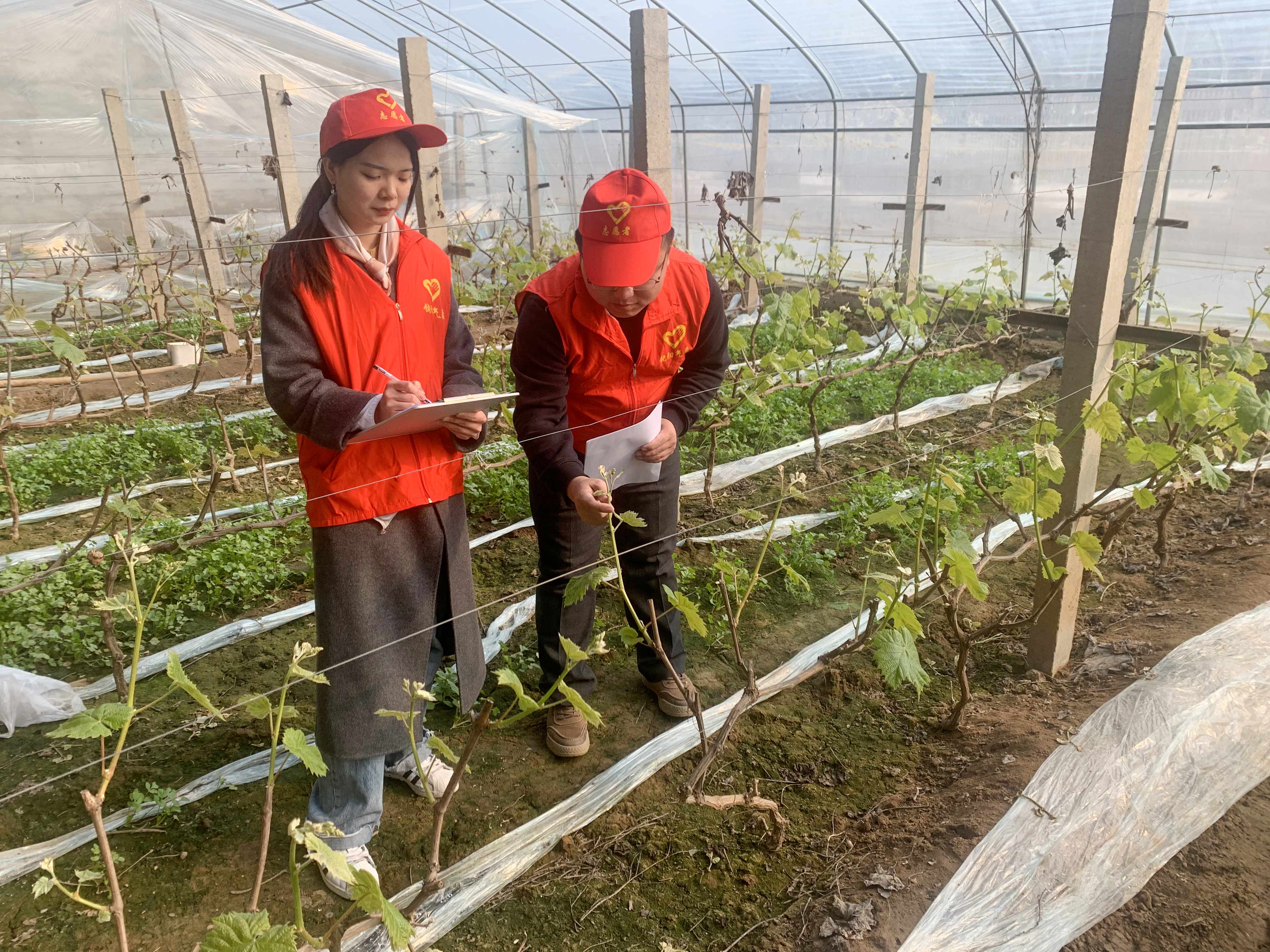 饶阳县气象局技术人员进温室调研葡萄长势。