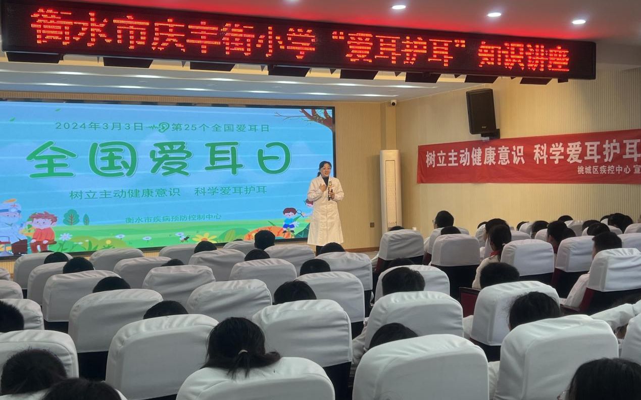 3月3日是第二十五个全国爱耳日,为增强青少年听力健康意识,减少、控制听力损失和残疾的发生,3月1日,桃城区疾控中心到市区庆丰街小学开展爱耳知识宣讲活动。