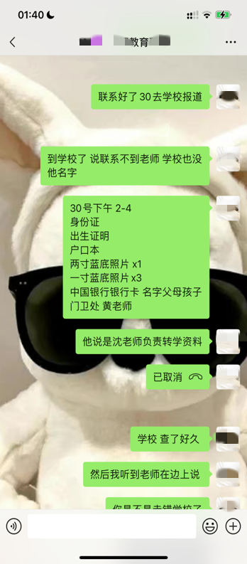 几天后,一名自称是该学校的徐老师联系了王先生,并指导家长和孩子准备转学手续和材料,然而等到家长准备上交材料时,徐老师却开始以各种理由拖延,直到临近春季开学前,转学事宜仍无望。