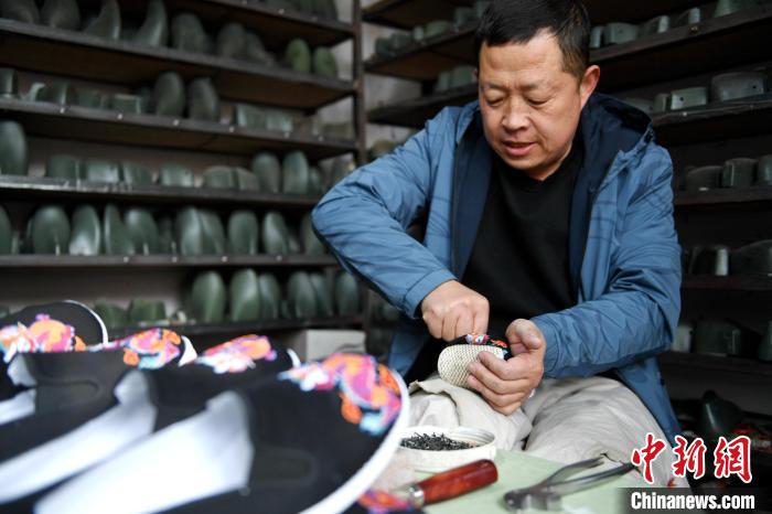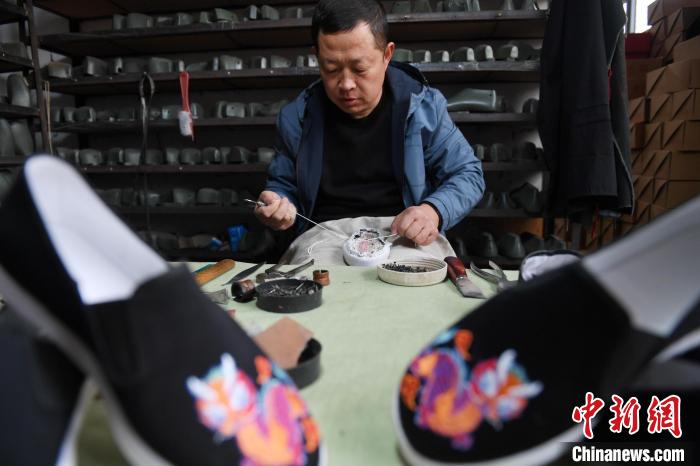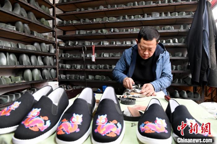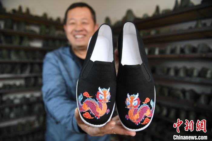 2月29日,走进河北省衡水市阜城县王集乡崔杨庄村的手工布鞋作坊,衡水市非物质文化遗产阜城手工布鞋技艺第三代传承人杨西利正忙着制作“龙元素”布鞋。