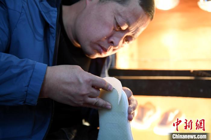 2月29日,杨西利正在去除鞋底多余的胶片。崔贤飞 摄