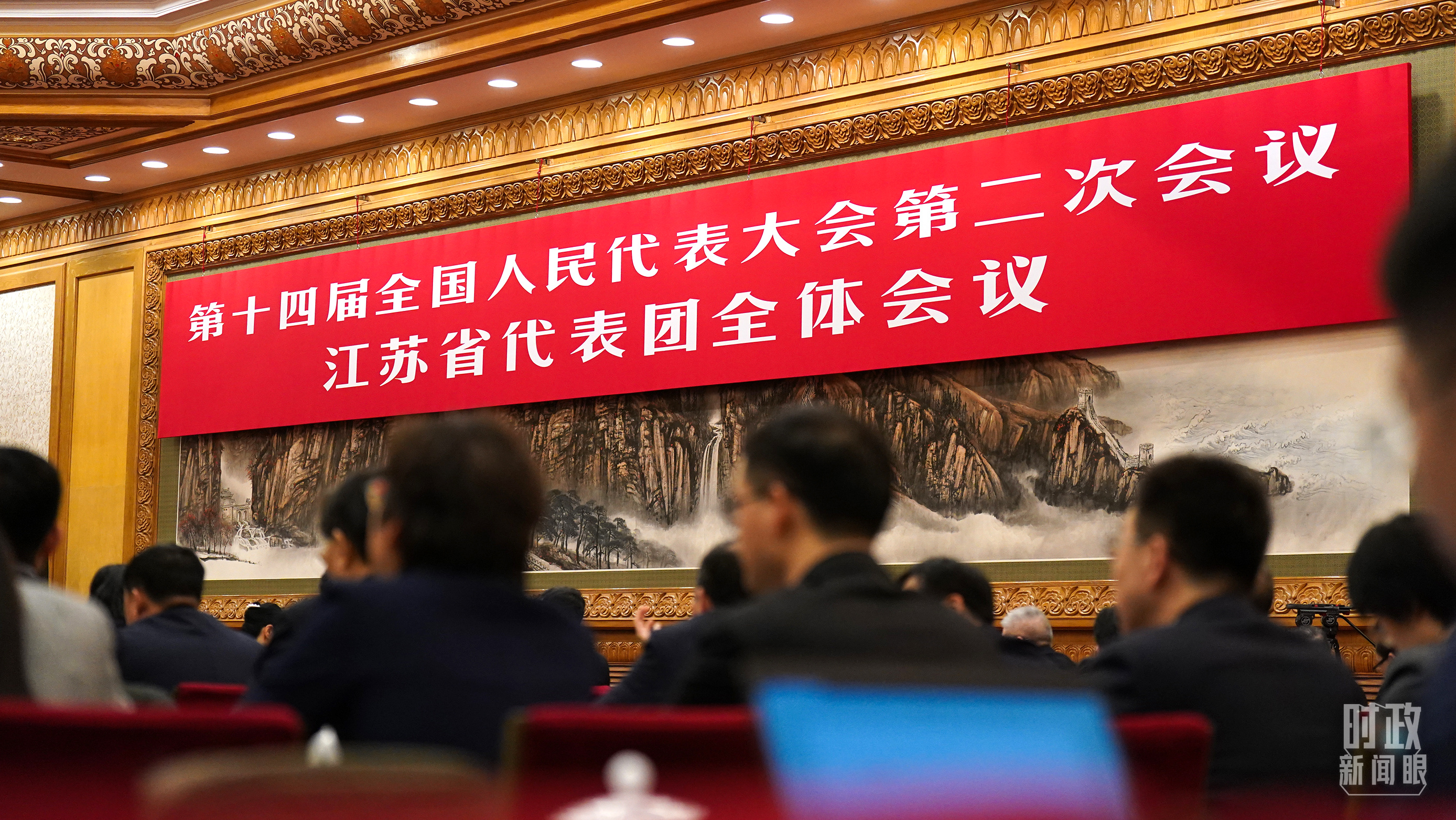 △江苏代表团全体会议,会标醒目。(总台国广记者李晋拍摄)