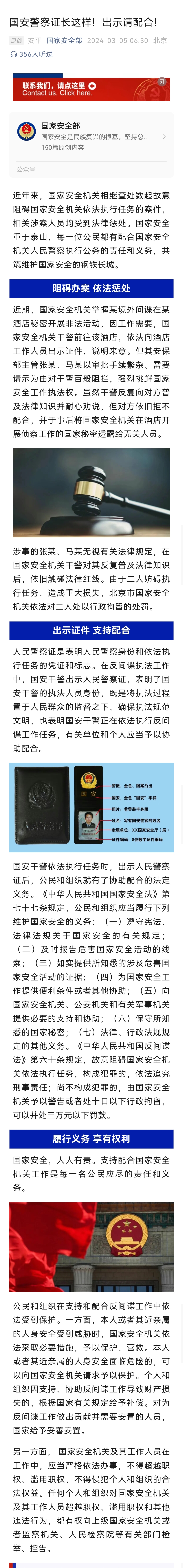 人民警察证是表明人民警察身份和依法执行任务的凭证和标志。国安干警依法执行任务时,出示人民警察证后,公民和组织就有协助配合的法定义务。(来源:“国家安全部”微信公众号)