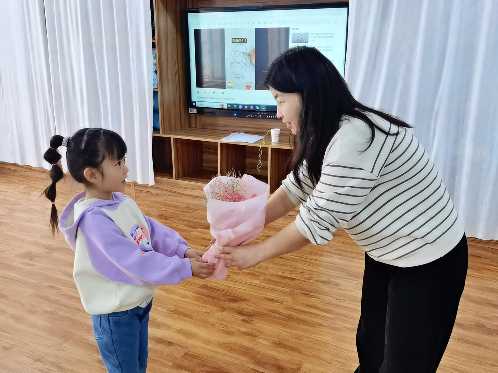 活动伊始,老师向孩子们介绍三月八日国际妇女节的由来和意义,并通过绘本阅读、名人事迹介绍等,让孩子们了解花木兰、屠呦呦、谷爱凌等古代和现代社会中一些杰出的女性人物,在孩子们心中播下梦想的种子。