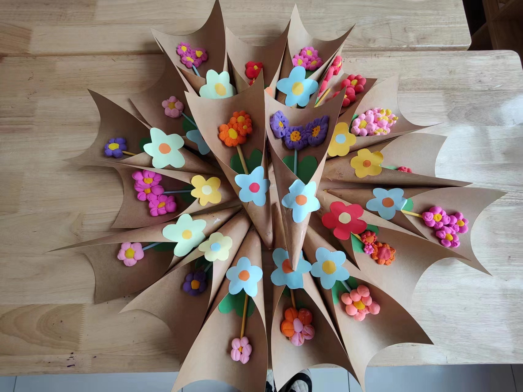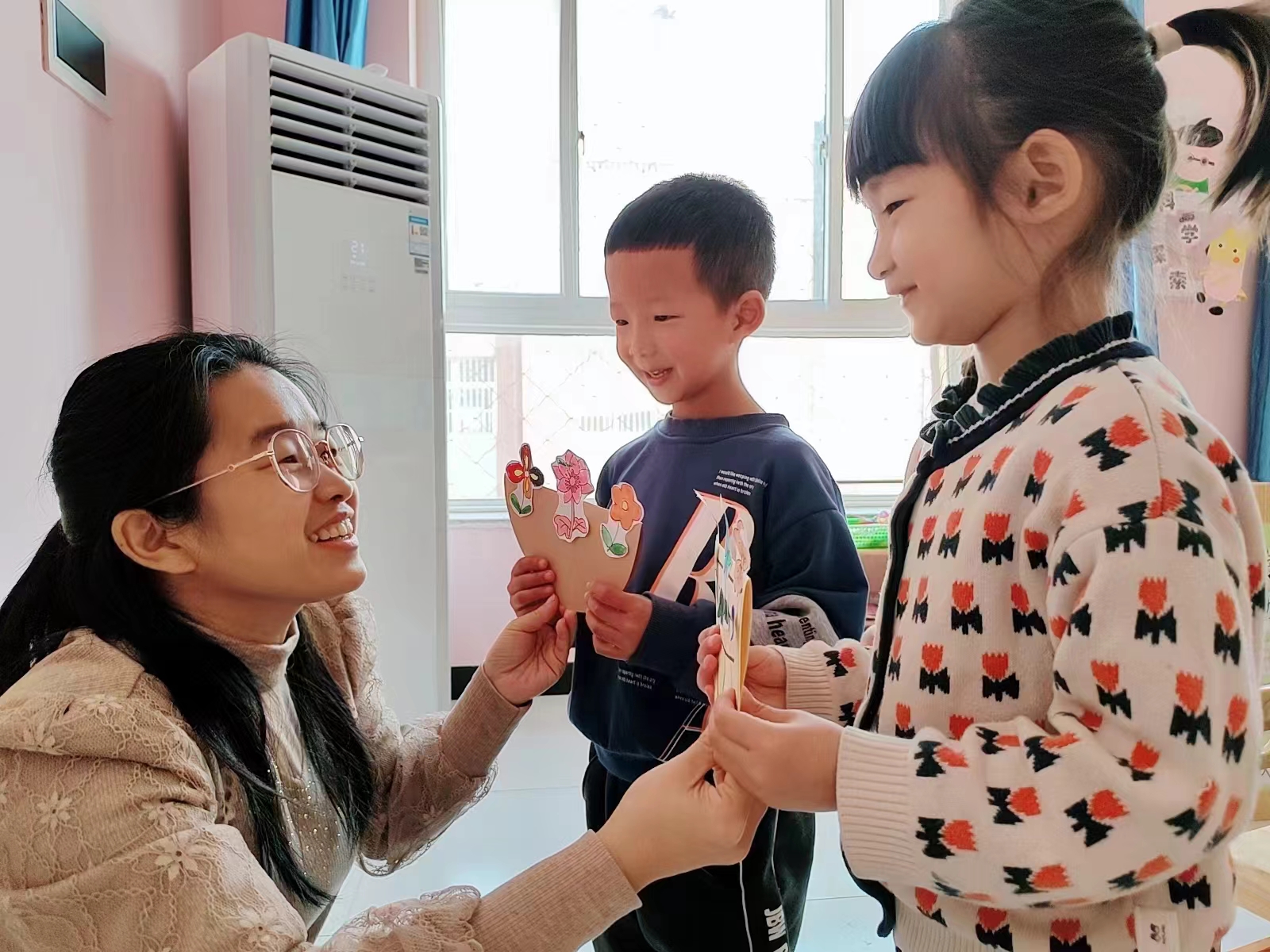随后,孩子们用稚嫩的小手发挥创意和想象力,为老师们制作精美的礼物。轻松愉悦的氛围中,孩子们完全沉浸在自我创作之中。时间一分一秒的过去,他们通过剪、粘、贴、画等程序把一张张平凡无奇的彩纸变成一朵朵美丽的“鲜花”、戒指、王冠……