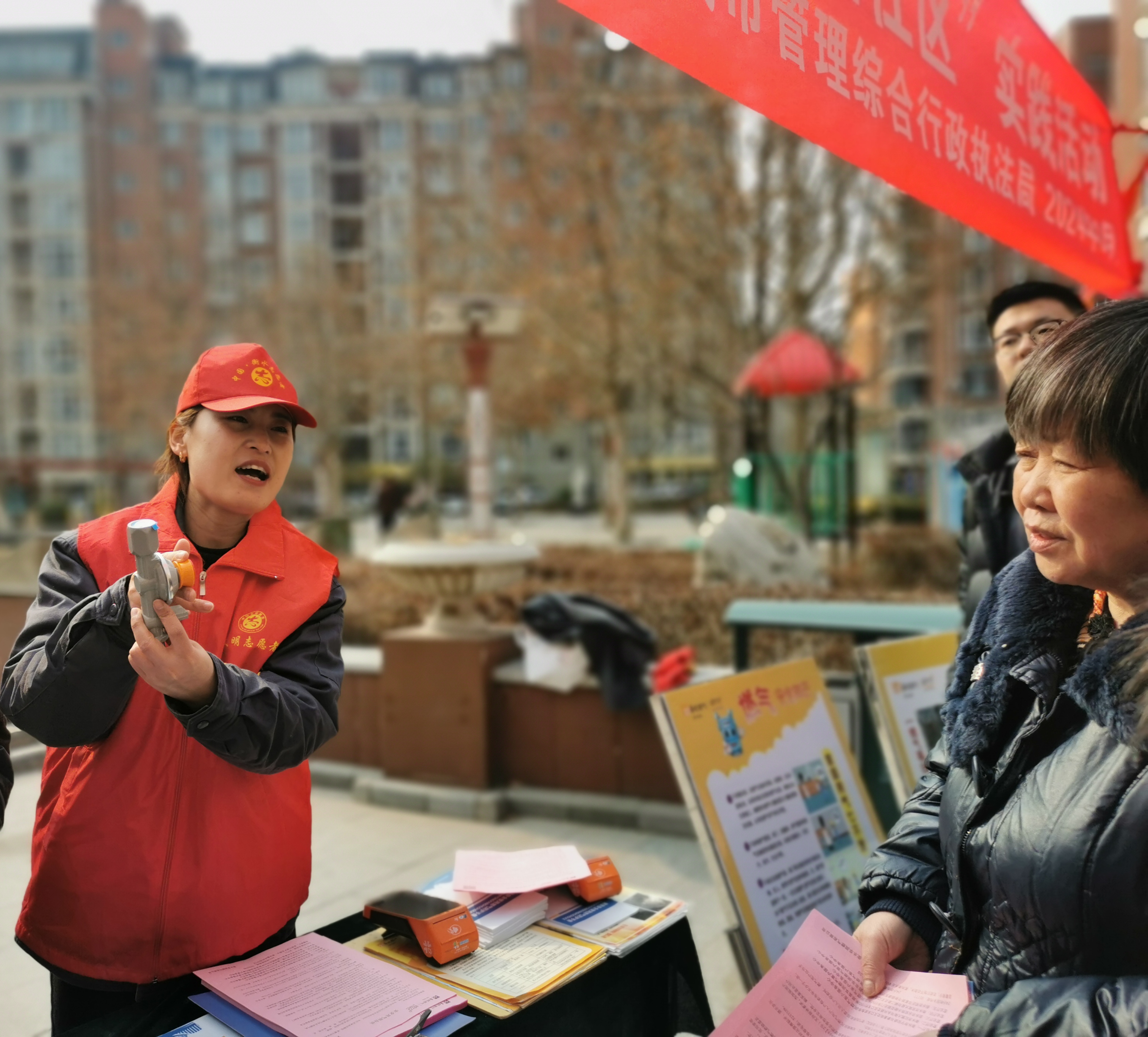 活动中,市城管局工作人员身穿志愿服务马甲,头戴小红帽,摆放宣传展牌,有序引导小区居民前来咨询,并向小区居民发放《居民安全使用燃气防护手册》《安全用气明白纸》《关于IC卡燃气表升级更换为物联网燃气表的告知书》等宣传材料,普及燃气科学常识,耐心细致地向小区居民讲解安全用气注意事项,叮嘱小区居民规范使用燃气,防止安全事故。