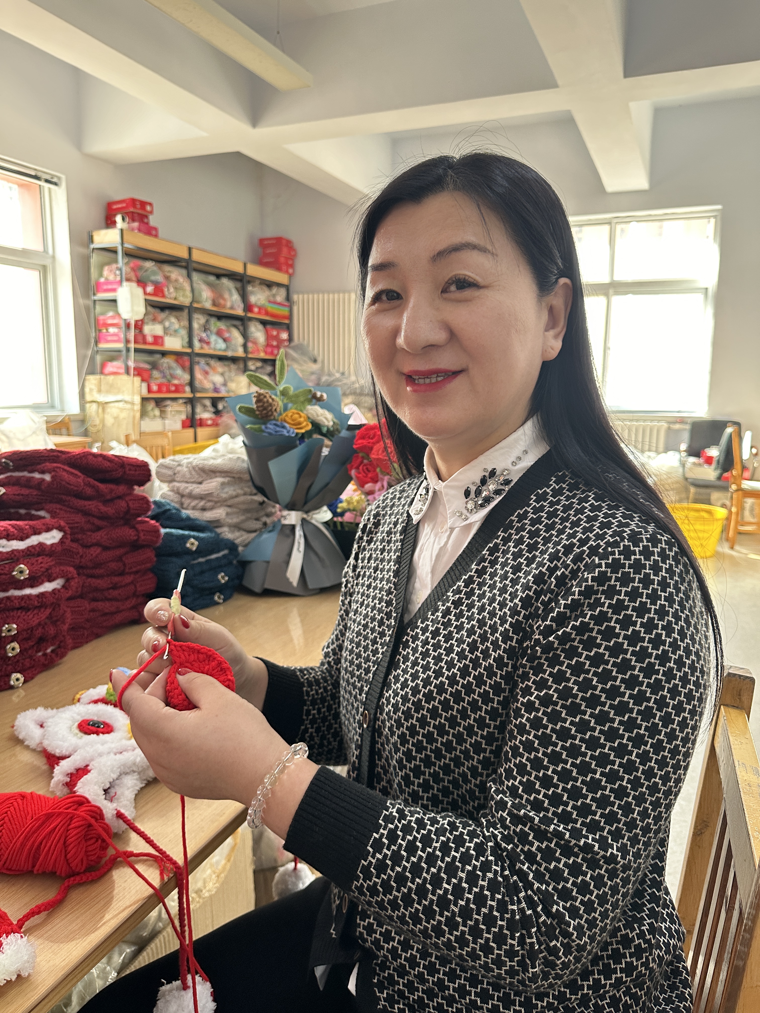张静红是衡水市鑫艺编织工坊的创办人。2003年,作为手工编织“能手”的张静红萌生了创业的想法,“一方面是想把手工编织传承下去,让更多的人了解、喜爱它,另一方面还是想着为我们周边的留守妇女提供一点帮助。”张静红告诉记者。近年来,张静红通过线下开设手工编织培训基地、线上直播免费教学手工编织技艺,为更多的人增加了收入来源。“三八”妇女节这天,张静红手中的钩针和线依然在不停翻飞,她说:“线是长长的,图案是美好的,编的是对生活的期许和眷恋,织的是心中畅想的未来画卷。”