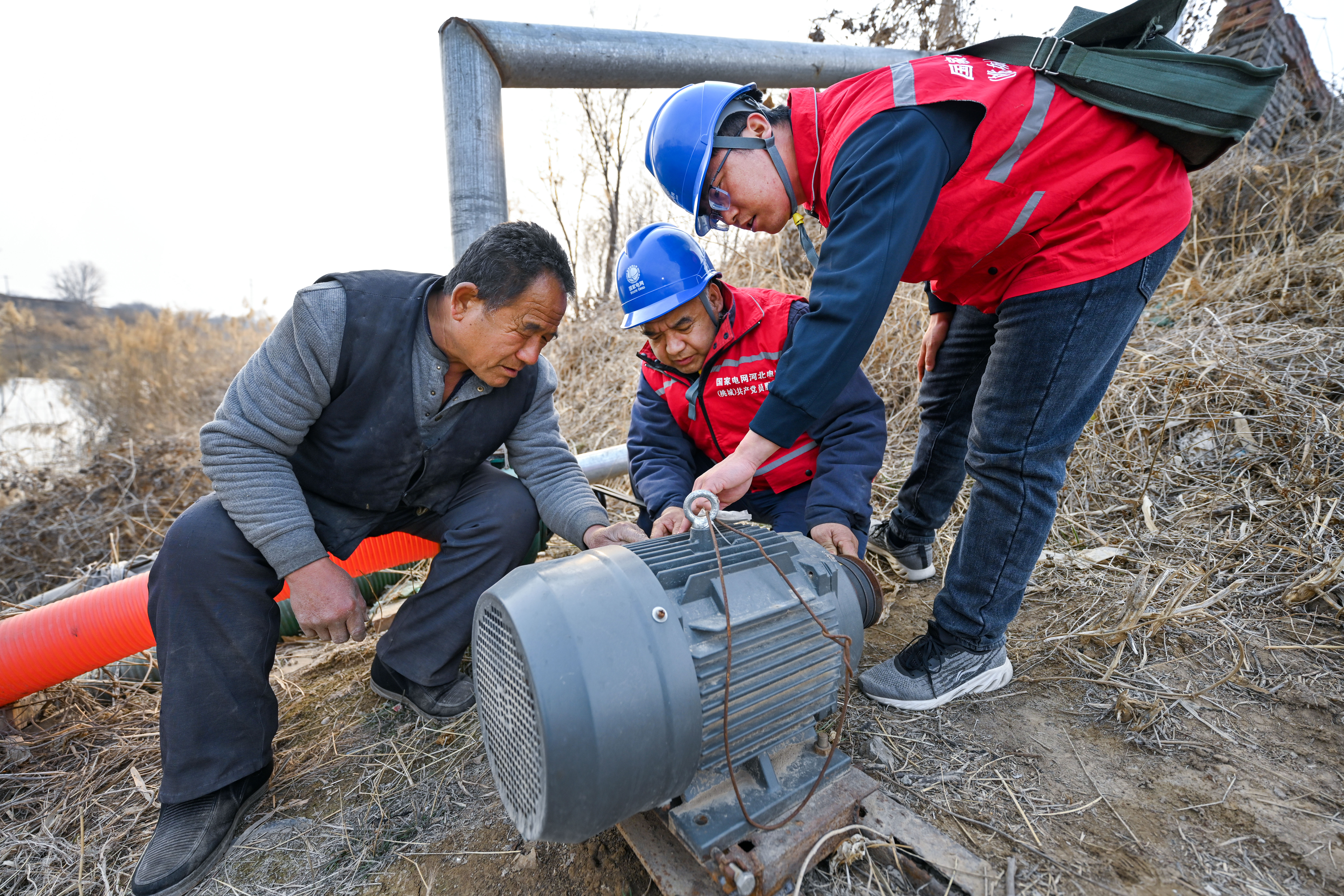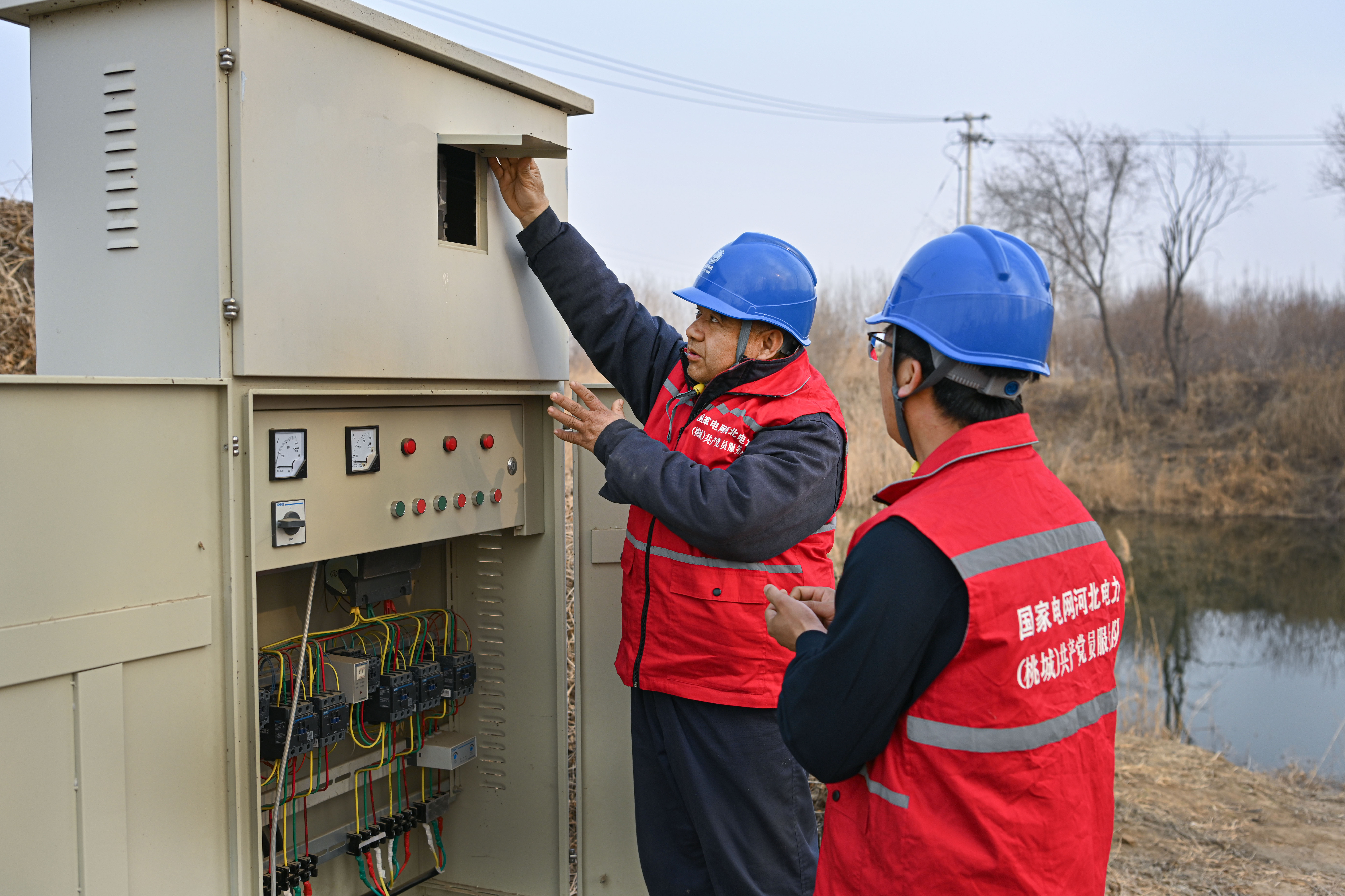 3月6日,国网衡水市桃城区供电公司党员服务队队员张延文和吴新华正在桃城区郑家河沿镇英庄村检查10千伏550国庄线运行情况和附近扬水站电机用电情况。“一切运行正常。”张延文说。