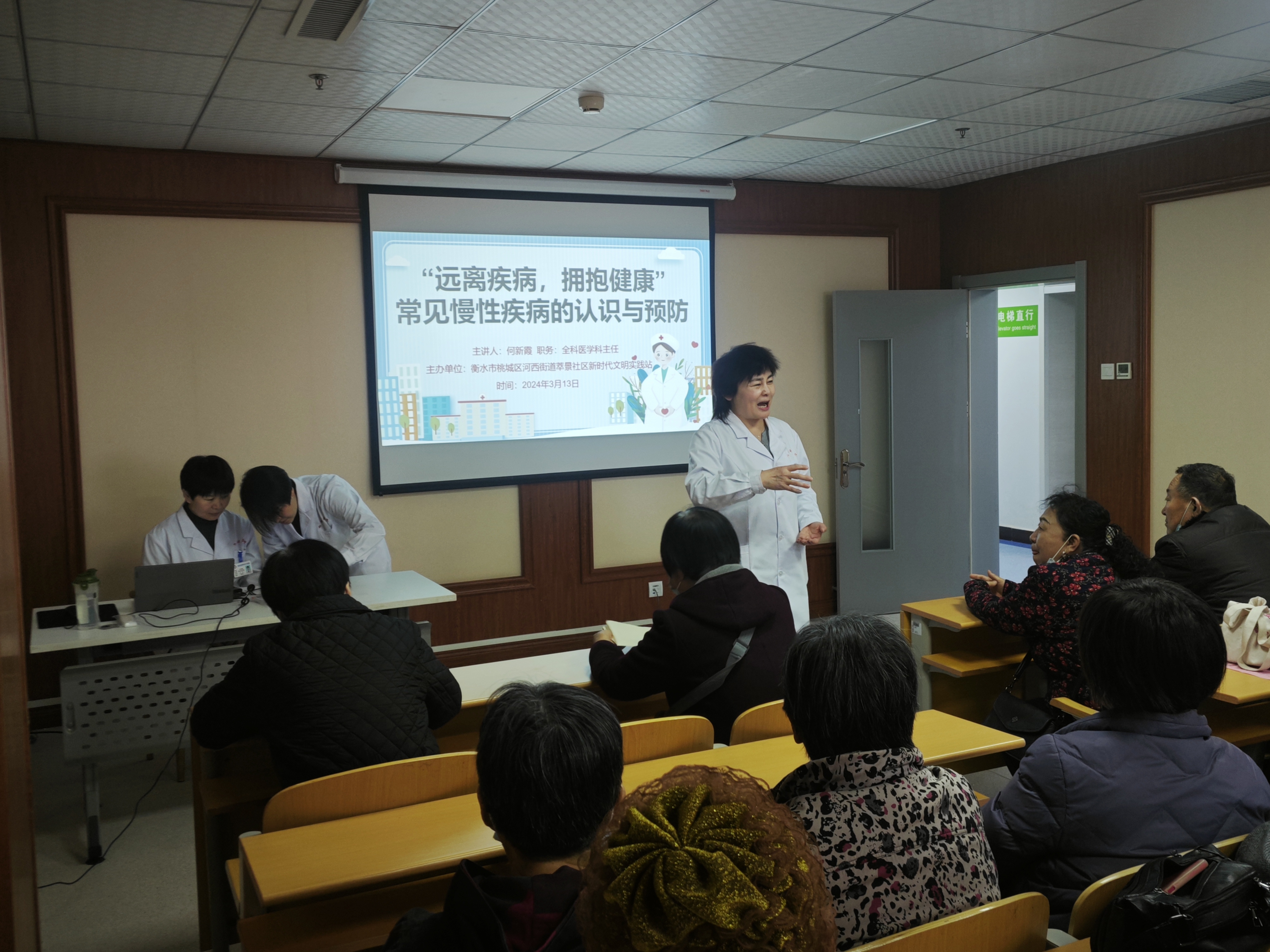 3月13日,衡水市人民医院体检中心内,一场以“远离疾病 拥抱健康”为主题的常见慢性疾病健康知识讲座开讲,为桃城区萃景社区的数十位居民尤其是老年人普及预防慢性病的健康知识。