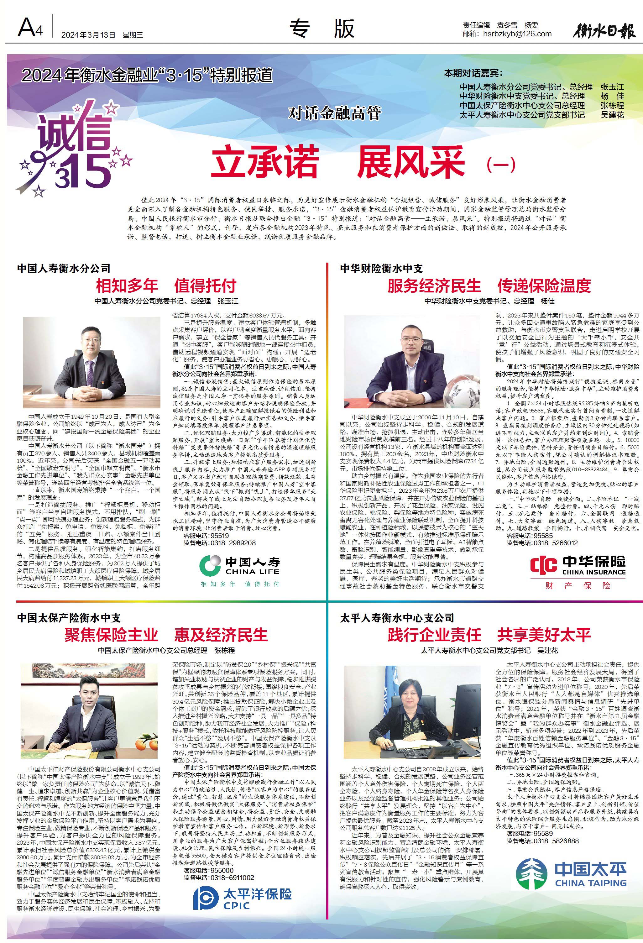 值此2024年“3·15”国际消费者权益日来临之际,为更好宣传展示衡水金融机构“合规经营、诚信服务”良好形象风采,让衡水金融消费者能更全面深入了解各金融机构特色服务、便民举措、服务承诺,国家金融监督管理总局衡水监管分局、中国人民银行衡水市分行、衡水日报社联合推出金融“3·15”特别报道:“对话金融高管——立承诺、展风采”。
