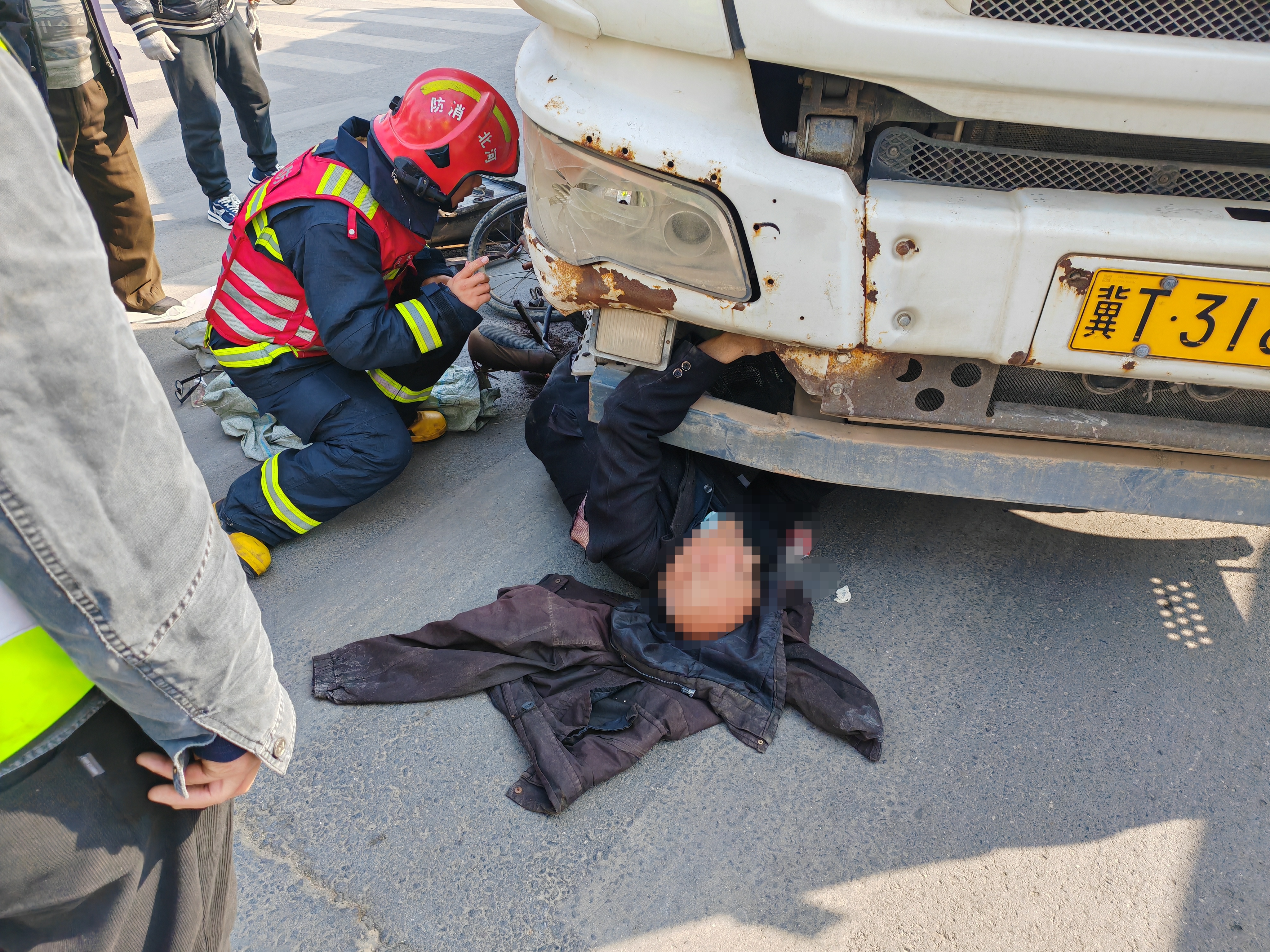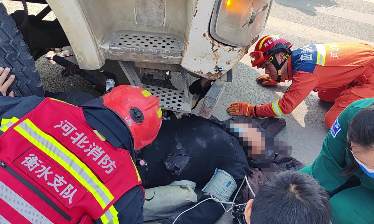 当日10时许,衡水市消防救援支队榕花街特勤站接到报警称:中华大街永安路十字路口发生一起交通事故,一辆商砼车与一辆三轮车相撞,骑三轮车的老人被困在商砼车下,情况十分危急。榕花街特勤站出动2车10人赶赴现场实施救援。