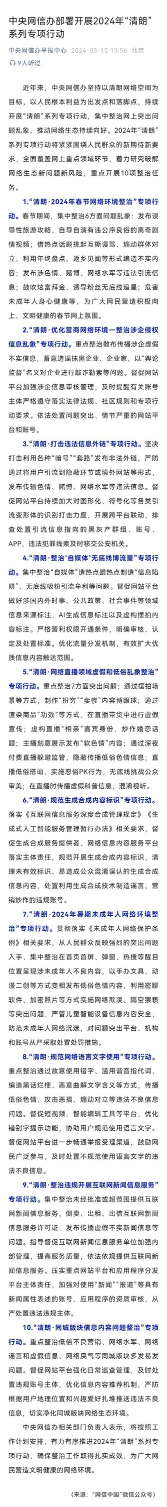 中央网信办部署开展2024年“清朗”系列专项行动