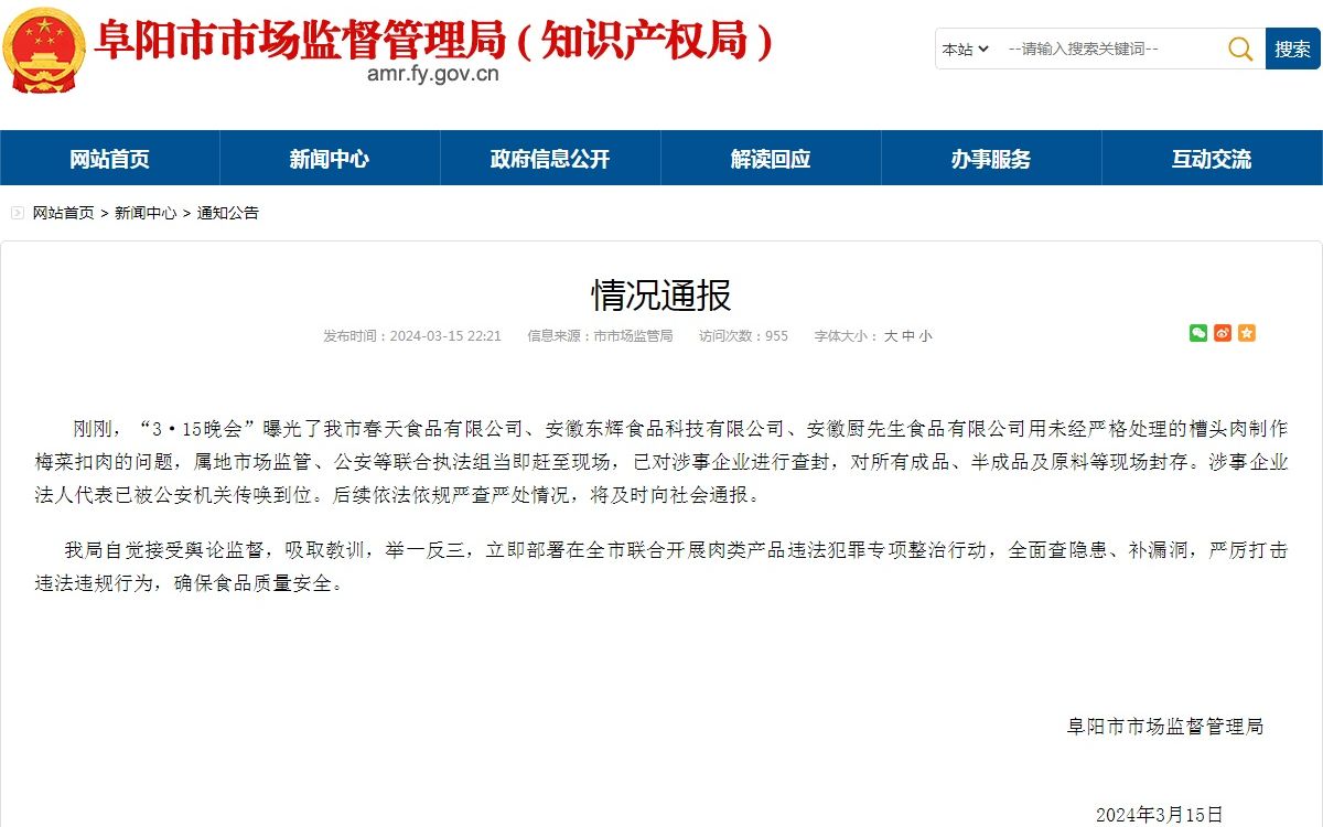 刚刚,“3·15晚会”曝光了我市春天食品有限公司、安徽东辉食品科技有限公司、安徽厨先生食品有限公司用未经严格处理的槽头肉制作梅菜扣肉的问题,属地市场监管、公安等联合执法组当即赶至现场,已对涉事企业进行查封,对所有成品、半成品及原料等现场封存。涉事企业法人代表已被公安机关传唤到位。后续依法依规严查严处情况,将及时向社会通报。