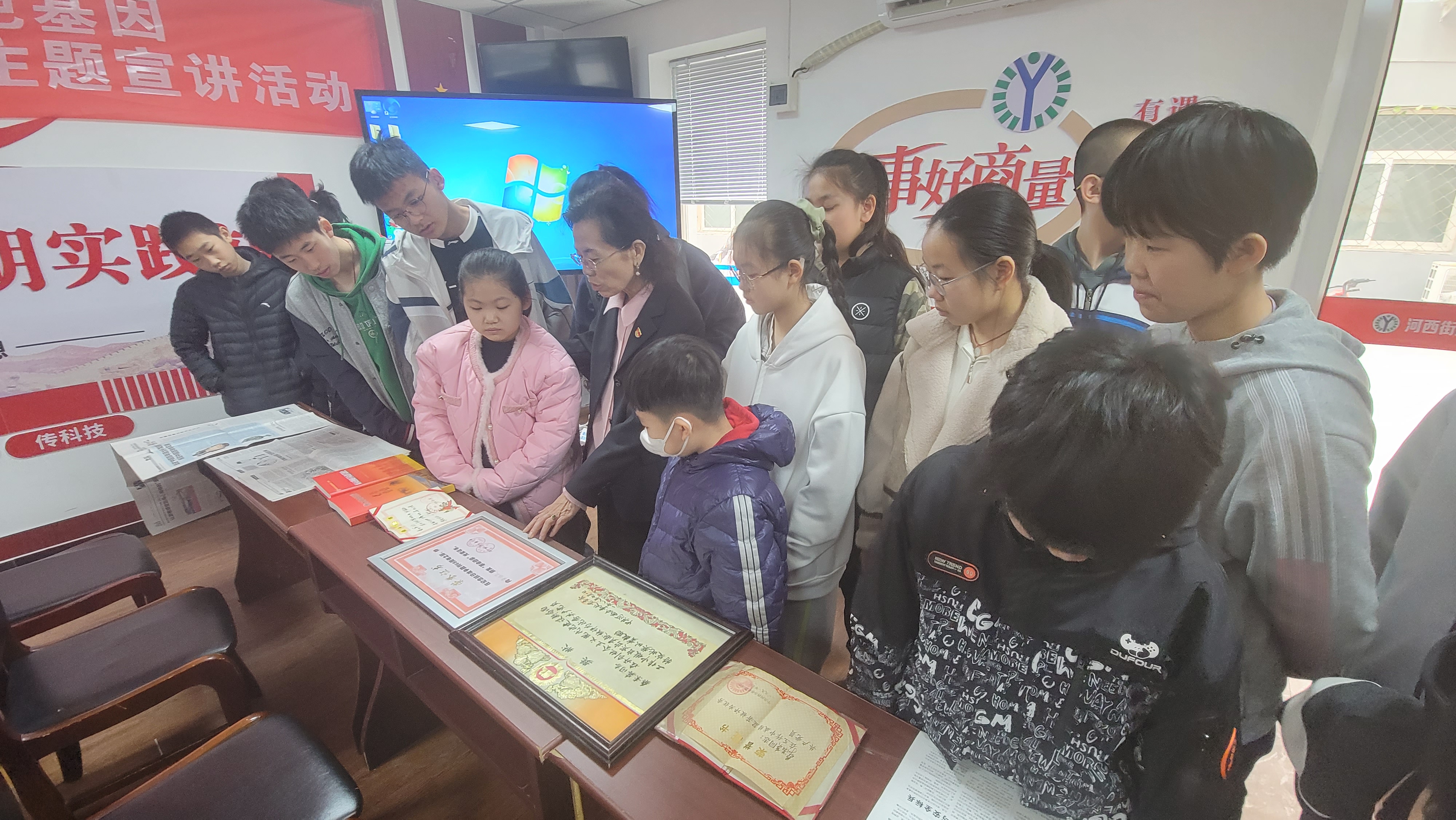 “革命母亲”光荣证书、优秀共产党员奖状、创建卫生城市“新容杯”奖状……满桌的奖状、证书都写有李兰慧母亲桑淑英的名字。向在场的学生们介绍过这些荣誉后,李兰慧将她母亲桑淑英的红色故事娓娓道来。
