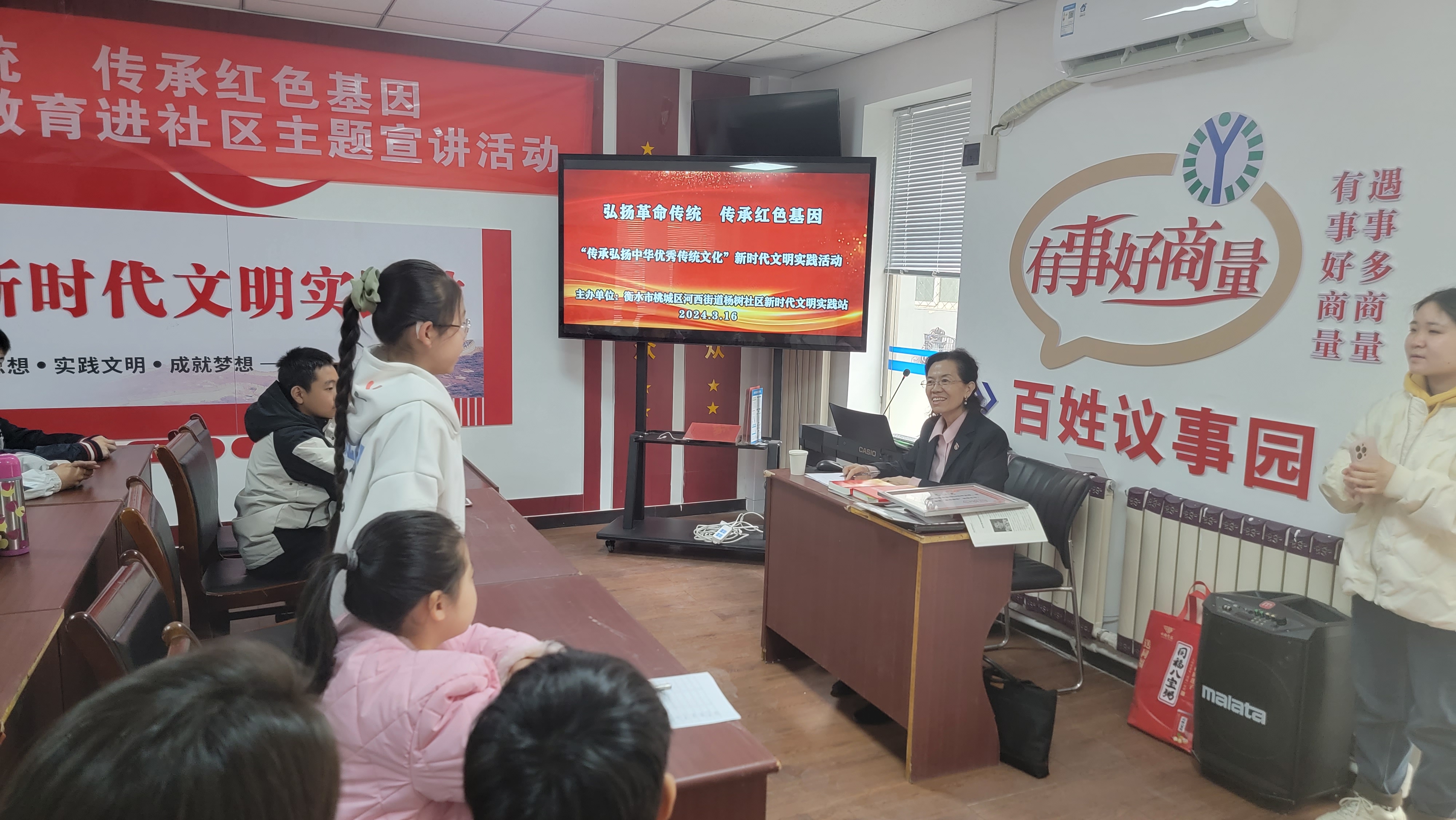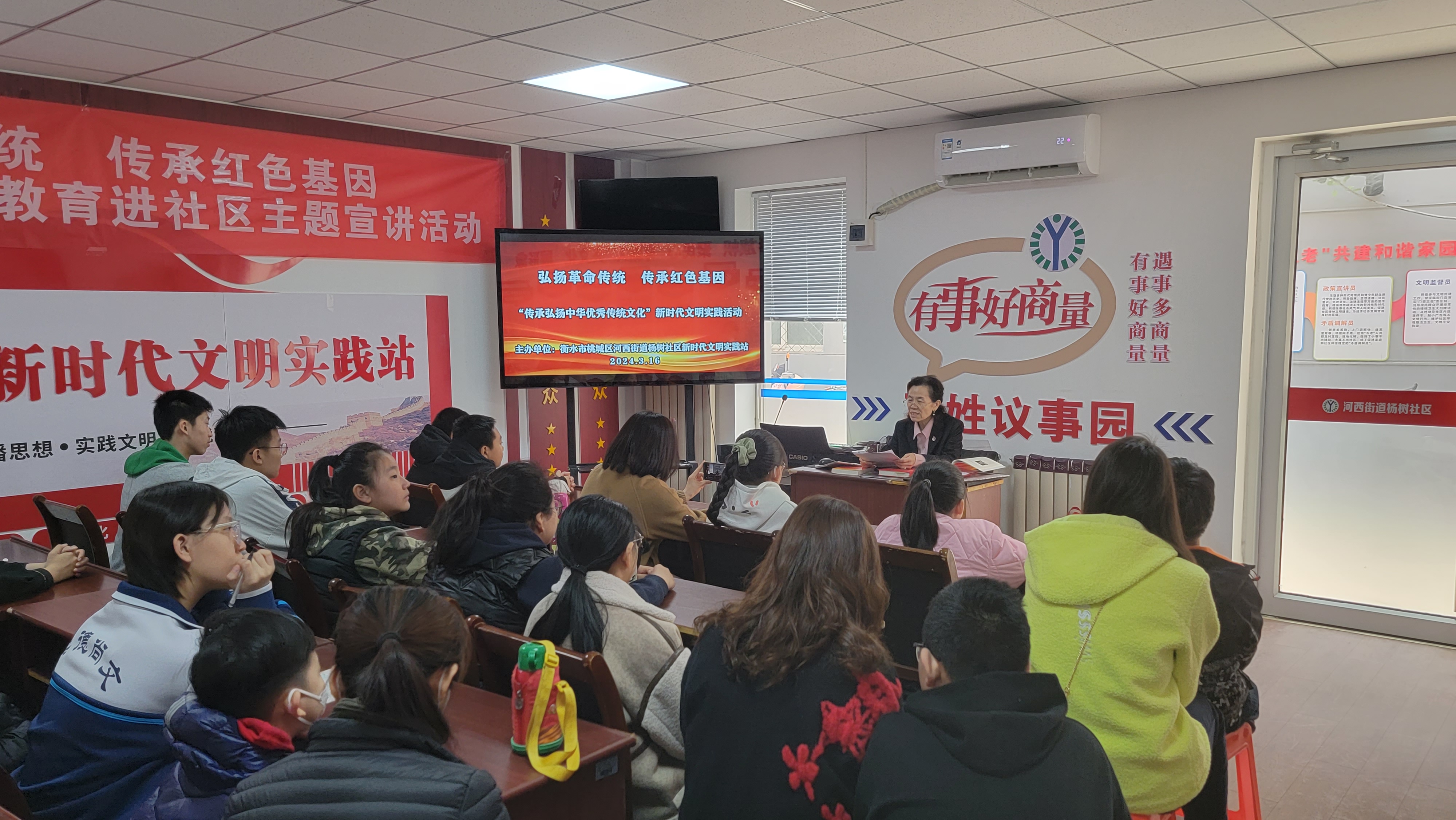今年是新中国成立75周年,也是《爱国主义教育法》施行的第一年。为重温红色岁月,赓续精神血脉,3月16日上午,衡水市桃城区河西街道杨树社区在社区新时代文明实践站,举行了一场主题为“弘扬革命传统、传承红色基因”的爱国主义教育宣讲活动。此次活动邀请了桃城区人大代表、社区老党员李兰慧作现场宣讲。