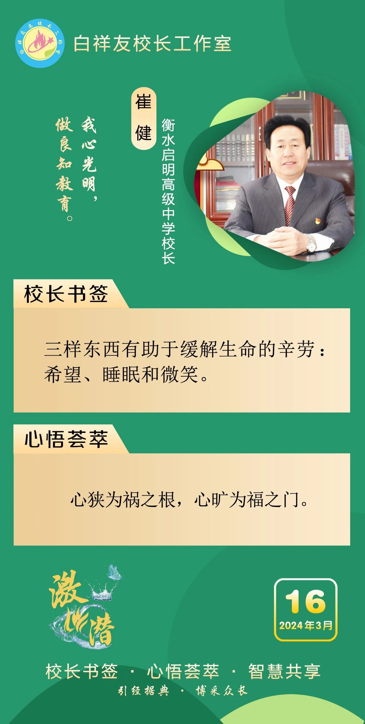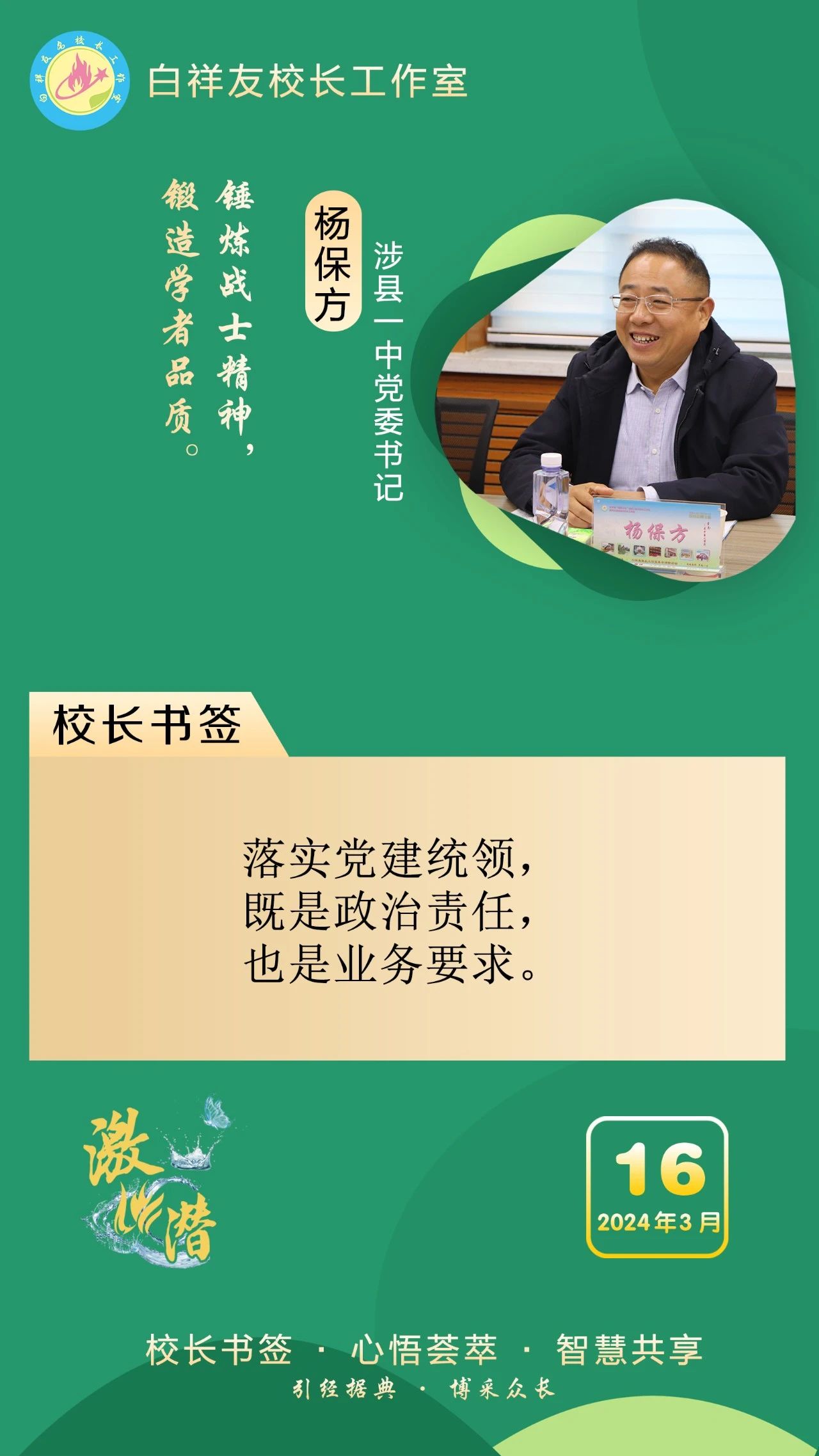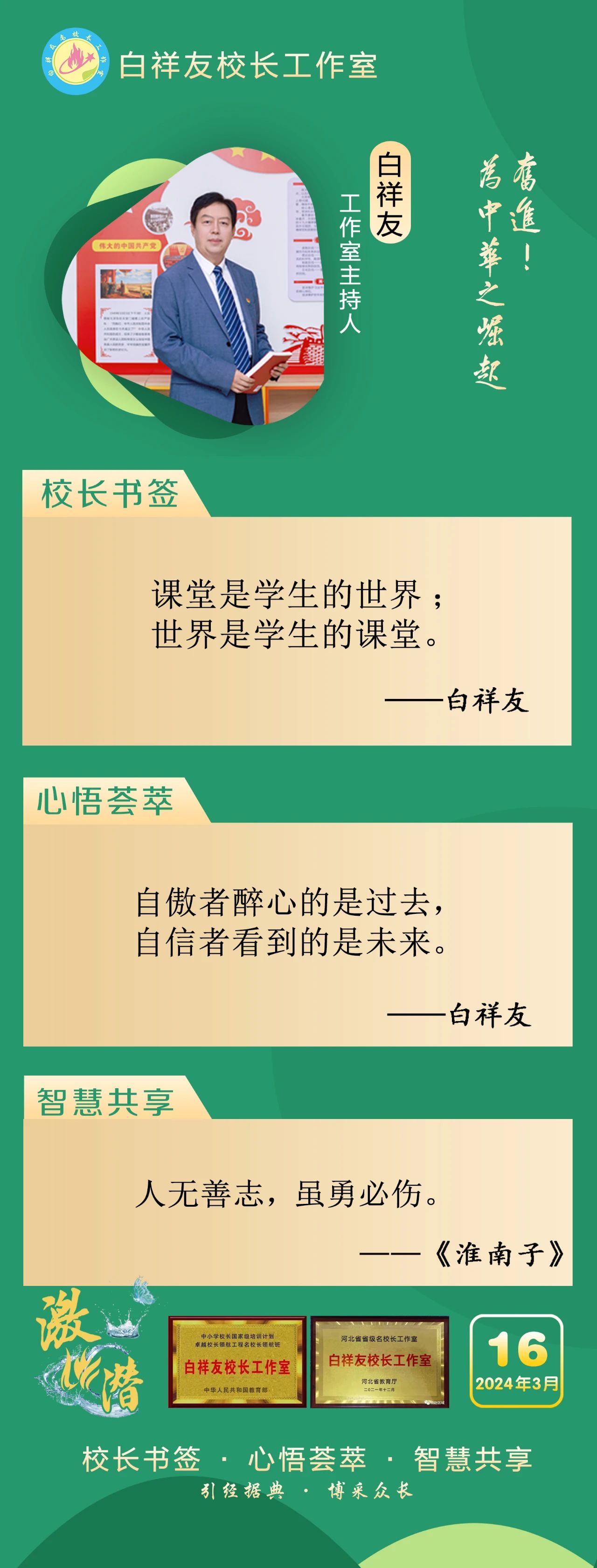 2019年4月,教育部“国培计划”名校长领航工程“白祥友校长工作室”成立。工作室主持人,衡水市教育局督学、衡水十三中党委书记白祥友,始终秉承教育报国的初心,时刻牢记为党育人、为国育才的教育使命,提出了“奋进!——为中华之崛起”的校训,践行“解放生命,激爆潜能,超越每刻,卓越一生”的激潜教育理念。