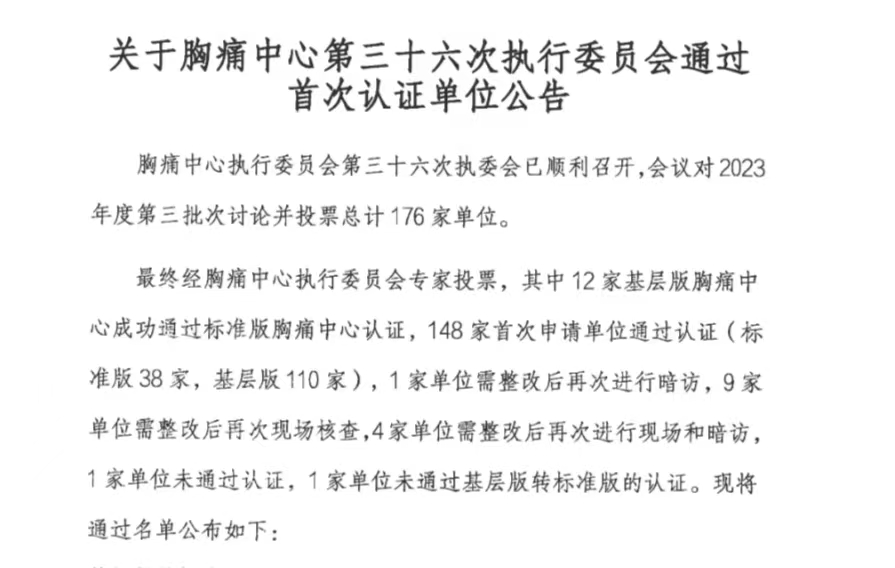 近日,在《关于胸痛中心第三十六次执行委员会通过首次认证单位公告》的名单里,首次通过认证的38家标准版胸痛中心单位中河北省有5家医院上榜,衡水市第五人民医院作为我市唯一一家医院位列其中。