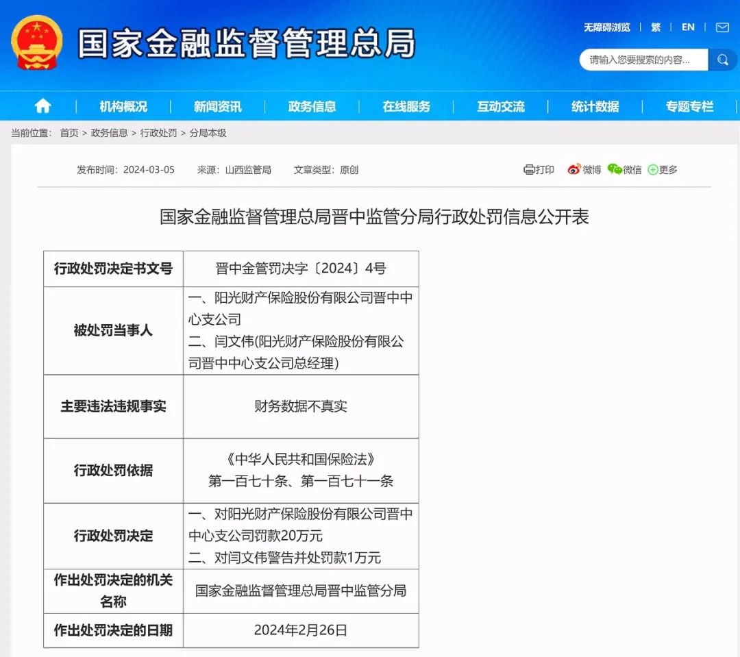 国家金融监督管理总局网站3月5日消息:因财务数据不真实,阳光财产保险股份有限公司晋中中心支公司被罚款20万元,闫文伟(阳光财产保险股份有限公司晋中中心支公司总经理)被罚款1万元。