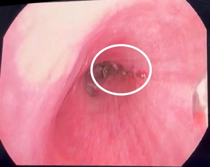 接诊后,胸外科医生借助院内CT检查发现,钢针并没有出现在消化道,而是停留在呼吸道内。分析钢针应该是卡顿在右肺下叶支气管开口处,气道内没有明显出血,因此联系内镜科医生会诊。