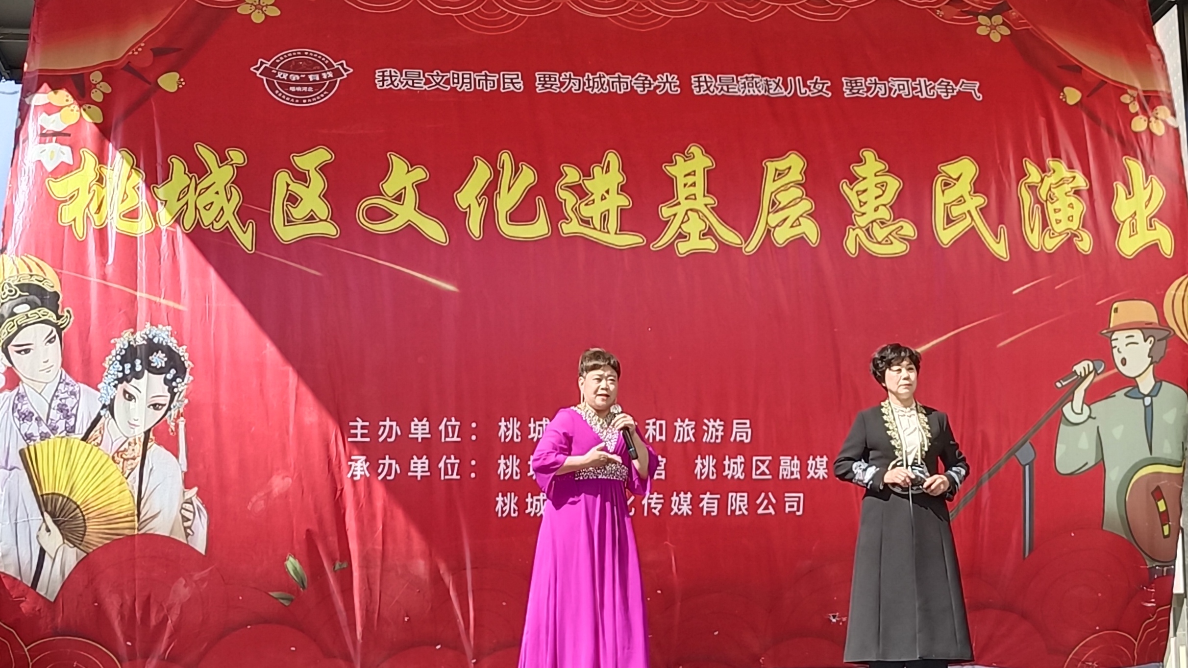 此次活动,由桃城区文化和旅游局主办,区文化馆、区融媒体中心、区文化传媒有限公司承办。本场演出以舞蹈《开门红》开场,欢快的旋律瞬间吸引了众多群众观看。河北梆子《龙江颂》选段、评剧《金沙江畔》选段、豫剧《抬花轿》、舞蹈《功夫扇》、歌曲《祖国你好》等十多个节目轮番上演。演出人员以高亢激越的唱腔、优美动人的舞姿、鲜亮活泼的小品,赢得围观群众连连鼓掌、喝彩。演员安会秀说:“咱们这个活动举办100多场了,不止在桃城区,我们还去各个县里给咱乡亲们送上‘文化大餐’!”