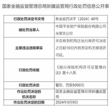 3月19日,国家金融监督管理总局新疆监管局发布行政处罚信息公开表,因未在收到机构迁址行政许可决定之日起10日内到发证机关换领许可证,对中国平安财产保险股份有限公司米泉支公司进行警告、罚款5000元处罚。