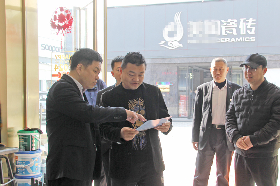 向商户(右)发放宣传资料。王梦琪 摄