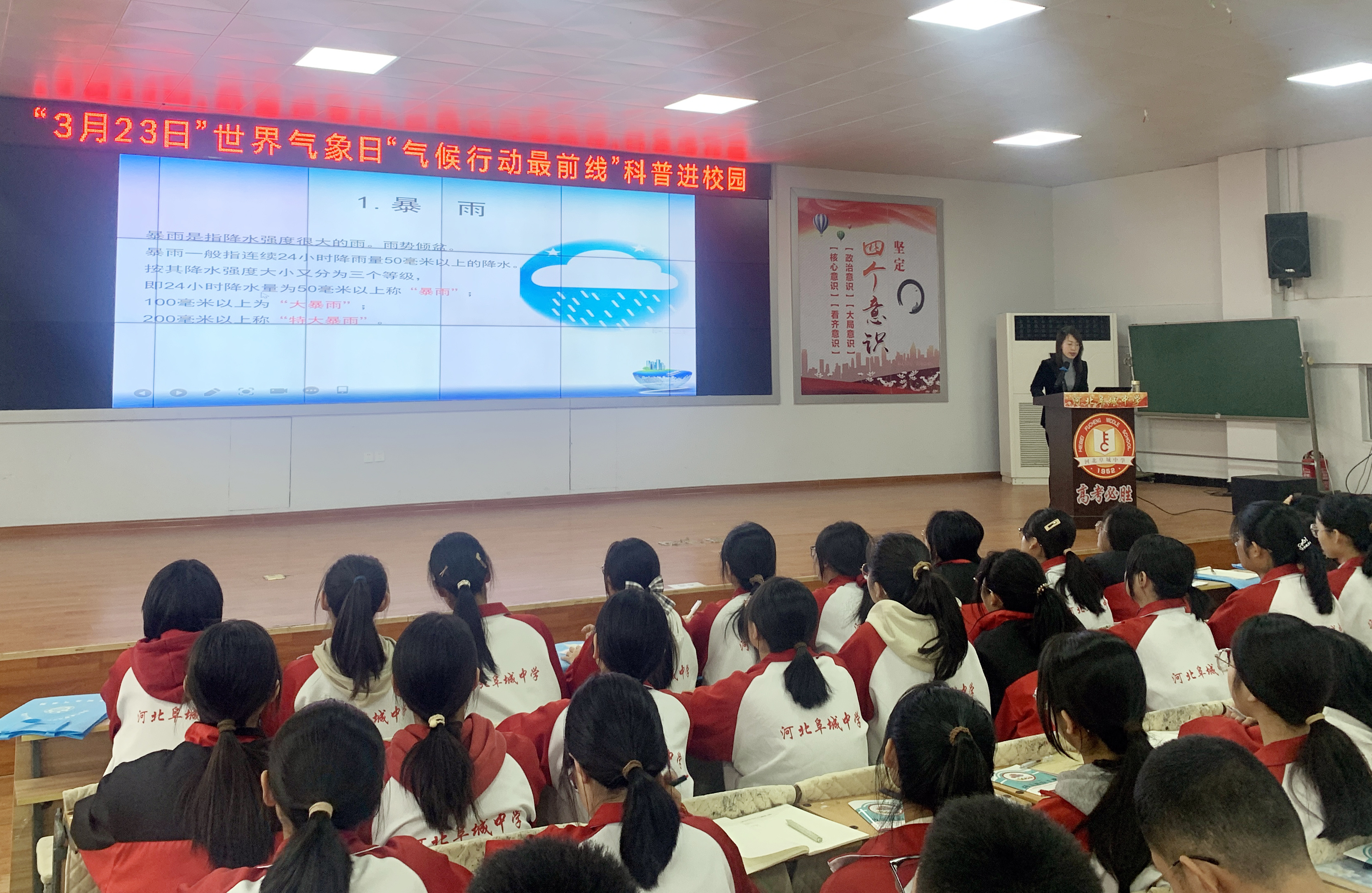 “如果有人说,在拉萨那里年日照3000小时以上,日夜温差大,这是不是也是指天气?其实则不然,前者是指天气,后者则是气候,两者概念不同。”……3月19日,河北阜城中学多媒体报告厅里,座无虚席,掌声阵阵,气氛热烈。阜城县气象局工作人员正对高一年级的全体师生们绘声绘色地讲解气象知识。