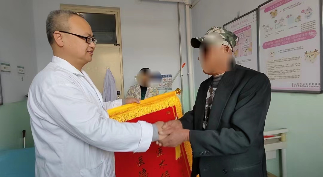 一个月前,《衡水晚报》05版刊登了一则《一位“红皮病”老年患者在衡水五院解除病痛》消息,3月23日,该患者与家属一起将一面锦旗亲手送到市五院皮肤科侯文超大夫的手中,表示感谢。
