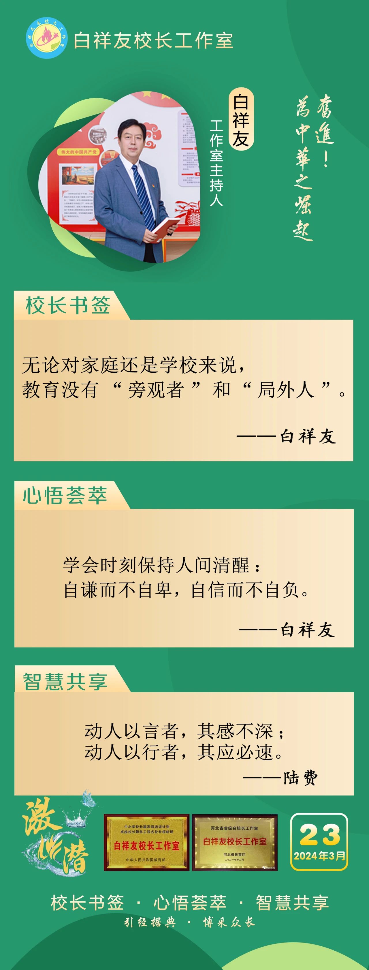 “白祥友校长工作室”成立于2019年4月,是教育部“国培计划”中小学名校长领航工程、河北省首批名校长工作室,目前省内外成员校20个。工作室坚持“资源共享、智慧共融、互助共赢”理念,已成为思想碰撞的交流场,资源共享的品牌站,成果展示的辐射源。