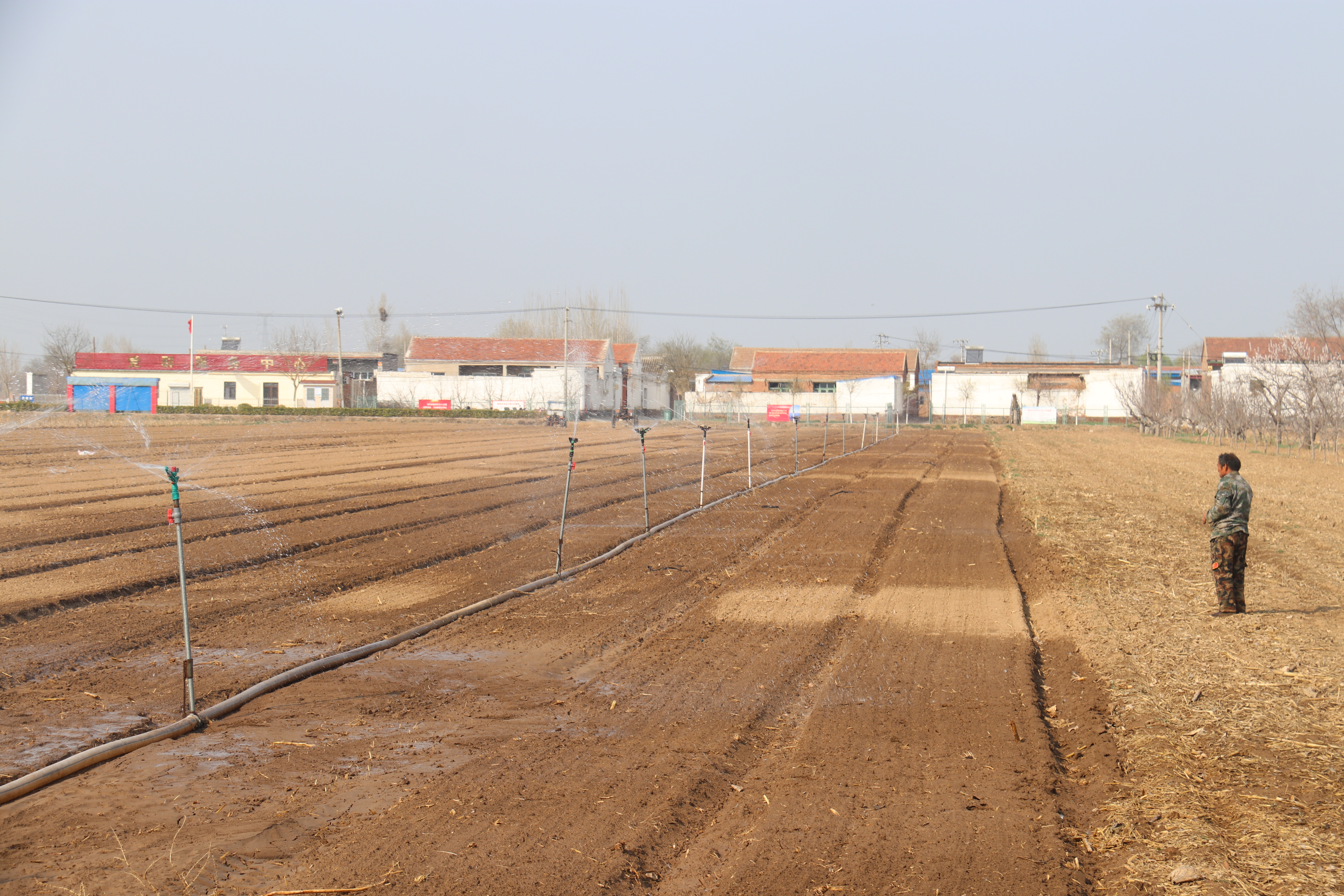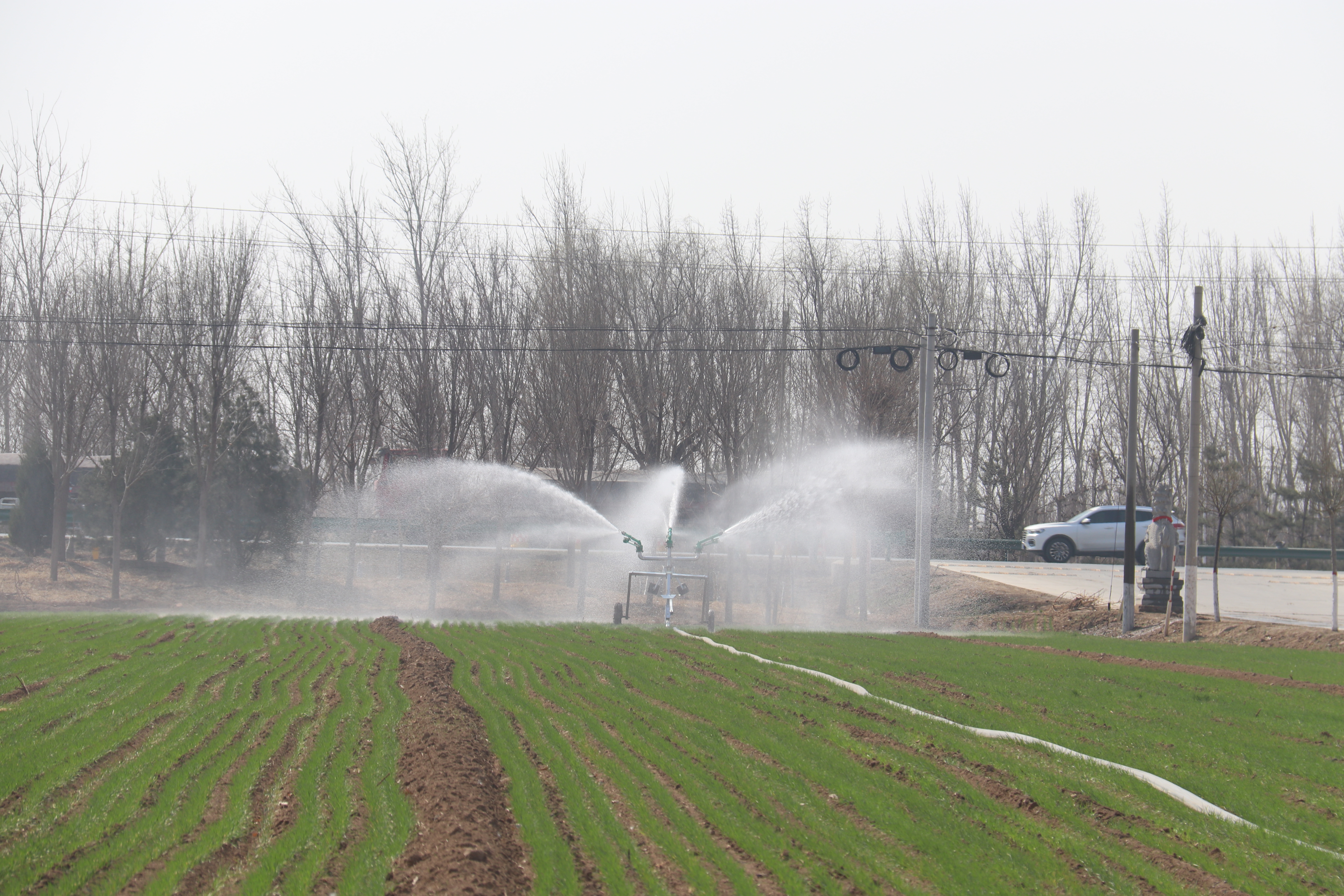 引水灌溉、喷灌、滴灌……眼下正值春耕备耕关键时节,在桃城区赵家圈镇,湍湍水流沿着田间地头的水渠一路奔流,还有先进的喷灌设备让灌溉用水均匀地洒落在田地间,使麦苗及时“喝”上了返青水,呈现出一幅生机盎然的田园图景。