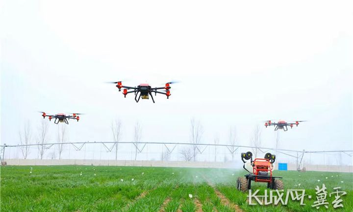 辛集市通过植保无人机飞防开展统防统治作业,相比传统的人工防治,植保无人机统防统治具有省力、快速、均匀的特点,能有效提高麦田防效。