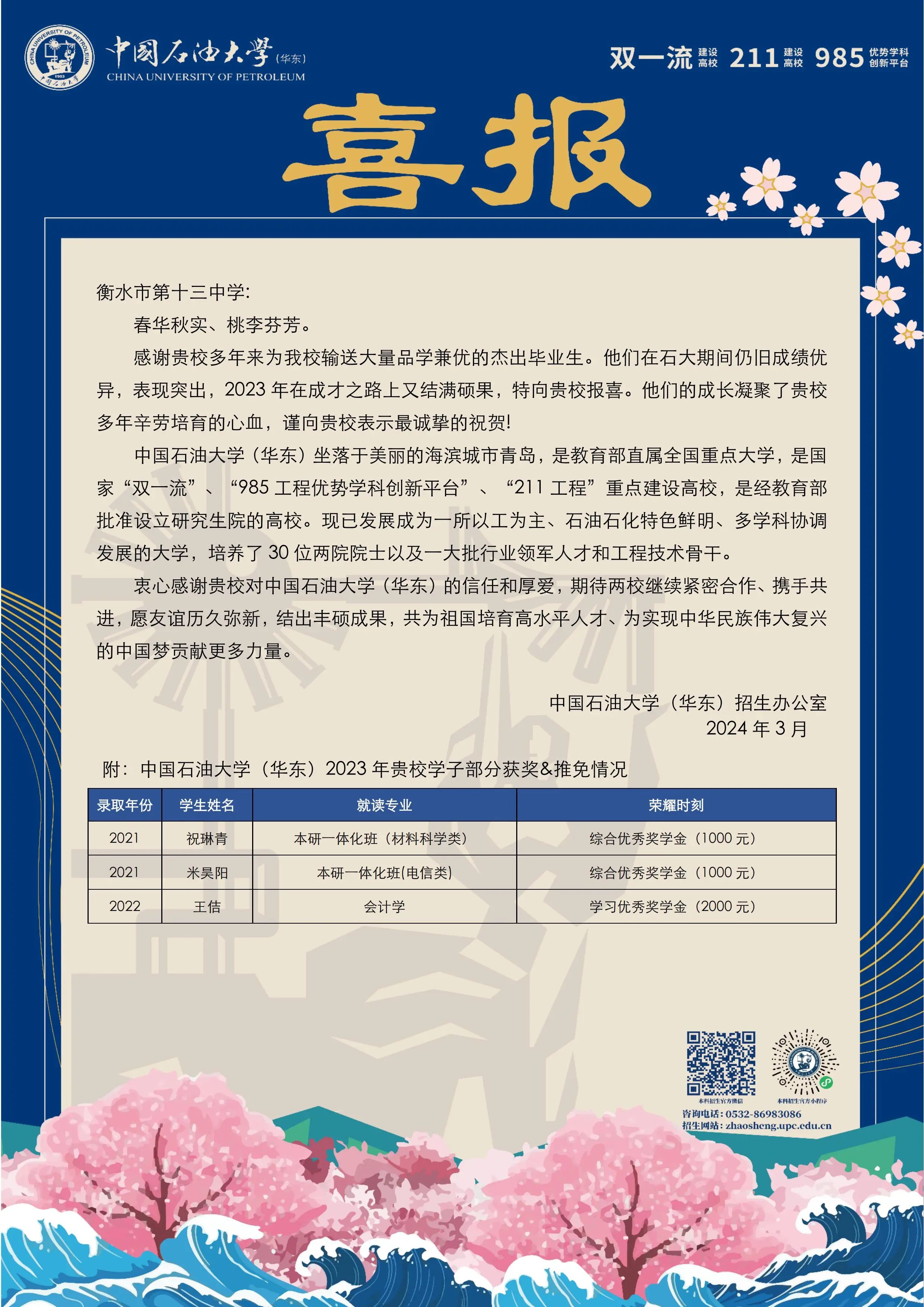 春华秋实,桃李芬芳。春日来信,喜报频传。近日,北京交通大学、中国石油大学(华东)分别向衡水十三中发来喜报,祝贺十三中毕业生在大学期间成绩优异、表现突出。喜报中提到,十三中优秀毕业生王金法、张艺、徐家怡、祝琳青、米昊阳、王佶等获得奖学金荣誉。