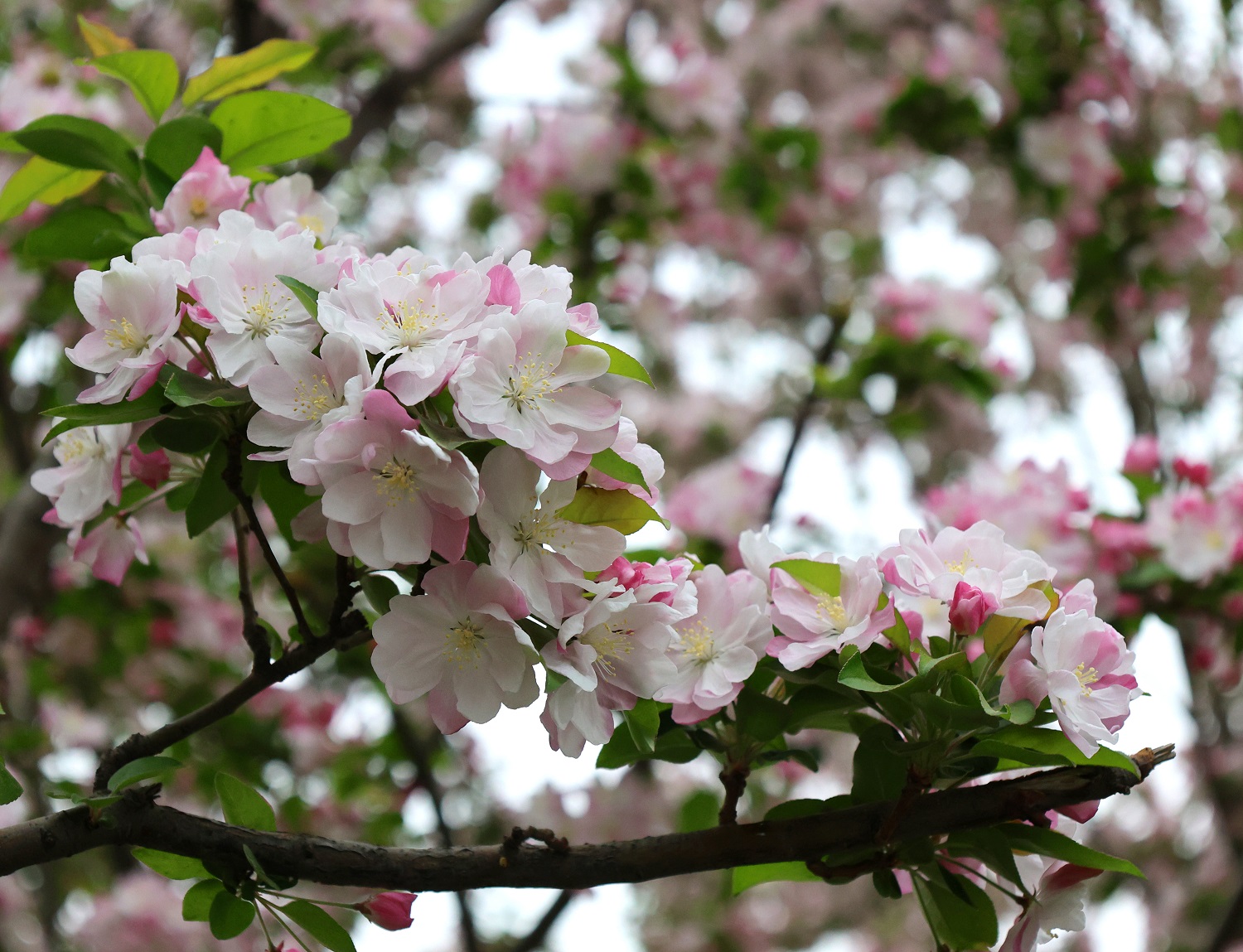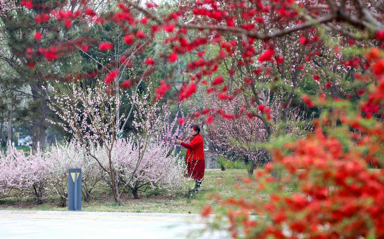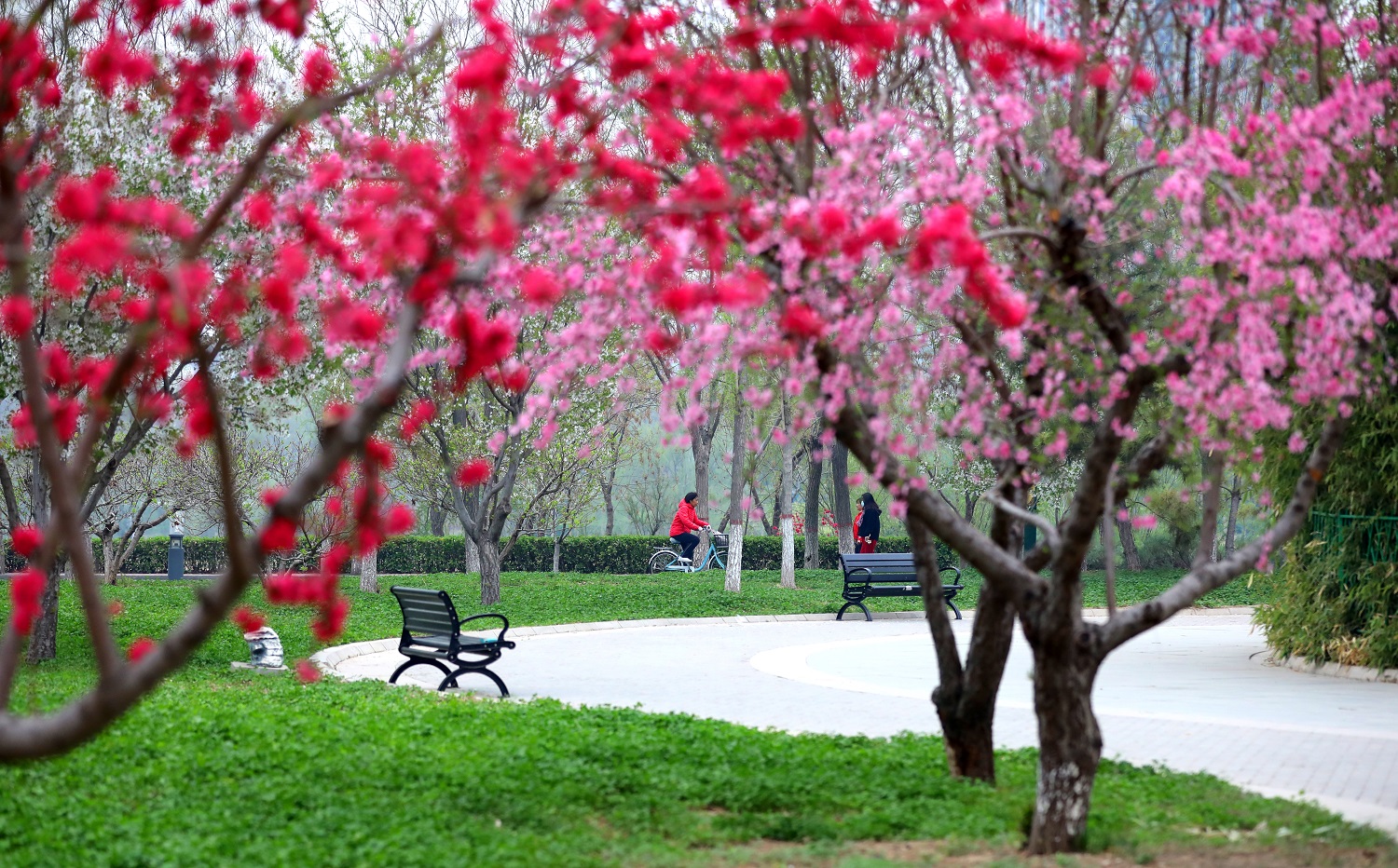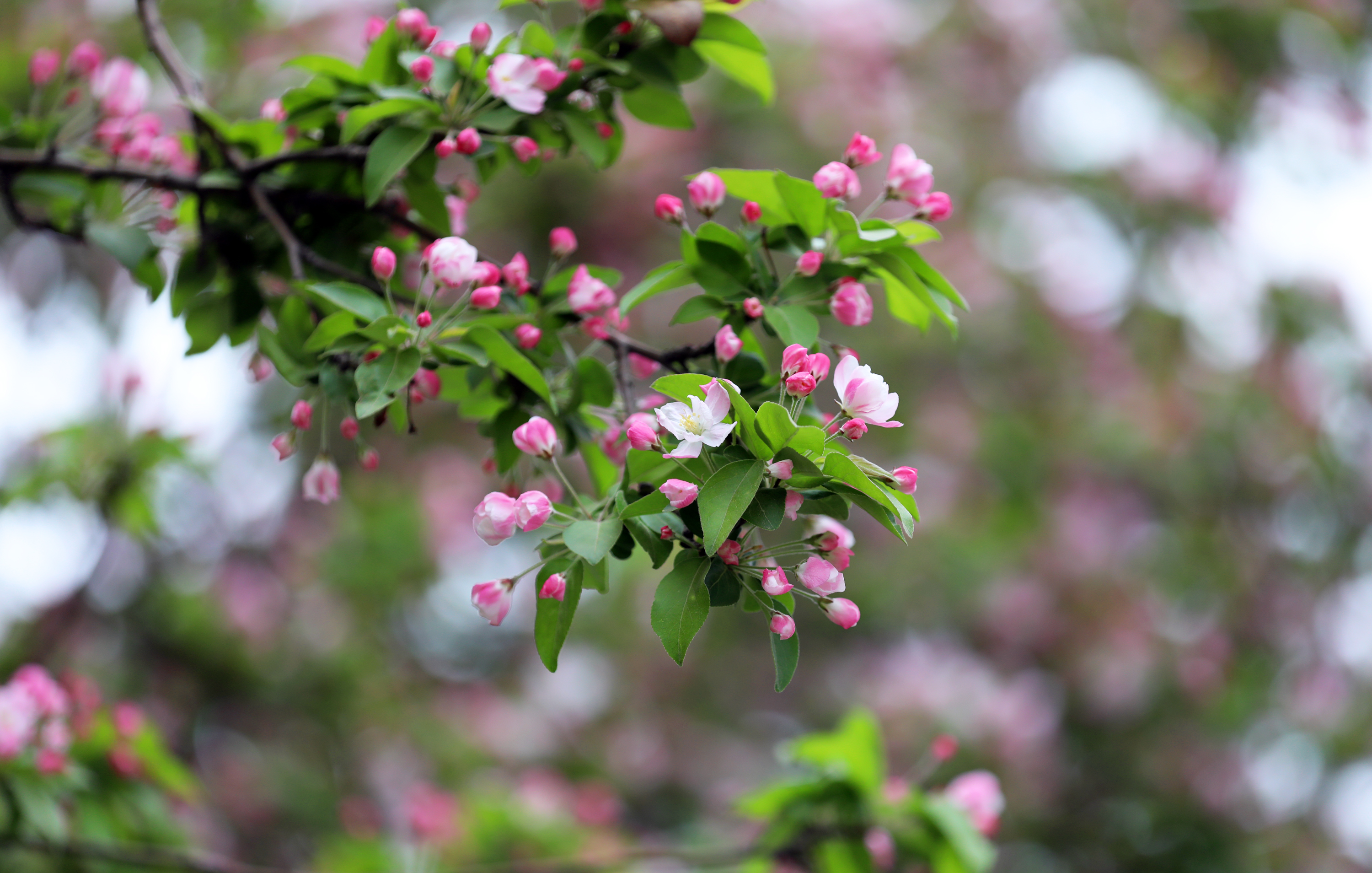 碧桃花、紫叶李、海棠花等多个品种竞相开放,花色不一、花型各异。在和煦的春风下,白色、粉色、桃红色的花朵与饱满的花苞在和煦的春风吹拂下,就像一群豆蔻少女,她们不施粉黛却娇俏可爱,用最直接的方式宣告春的到来。