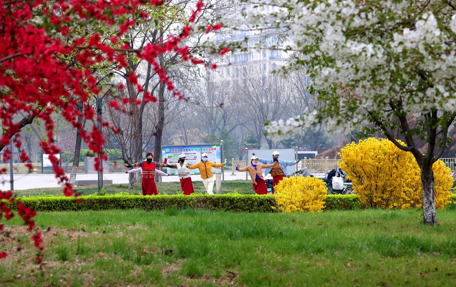 散步、骑行、跳操……市民选择在这里享受着大自然赐予的美好时光。有人拿起手机,摆出各式各样的姿势,定格下这快乐的一刻。一张张照片见证了春天的到来,也留下了每个人幸福的笑容。“太漂亮了,千姿百态,美不胜收!”正在游玩的市民张女士说,过了一个冬天,每个人也都想出来去感受春天的这种气息。