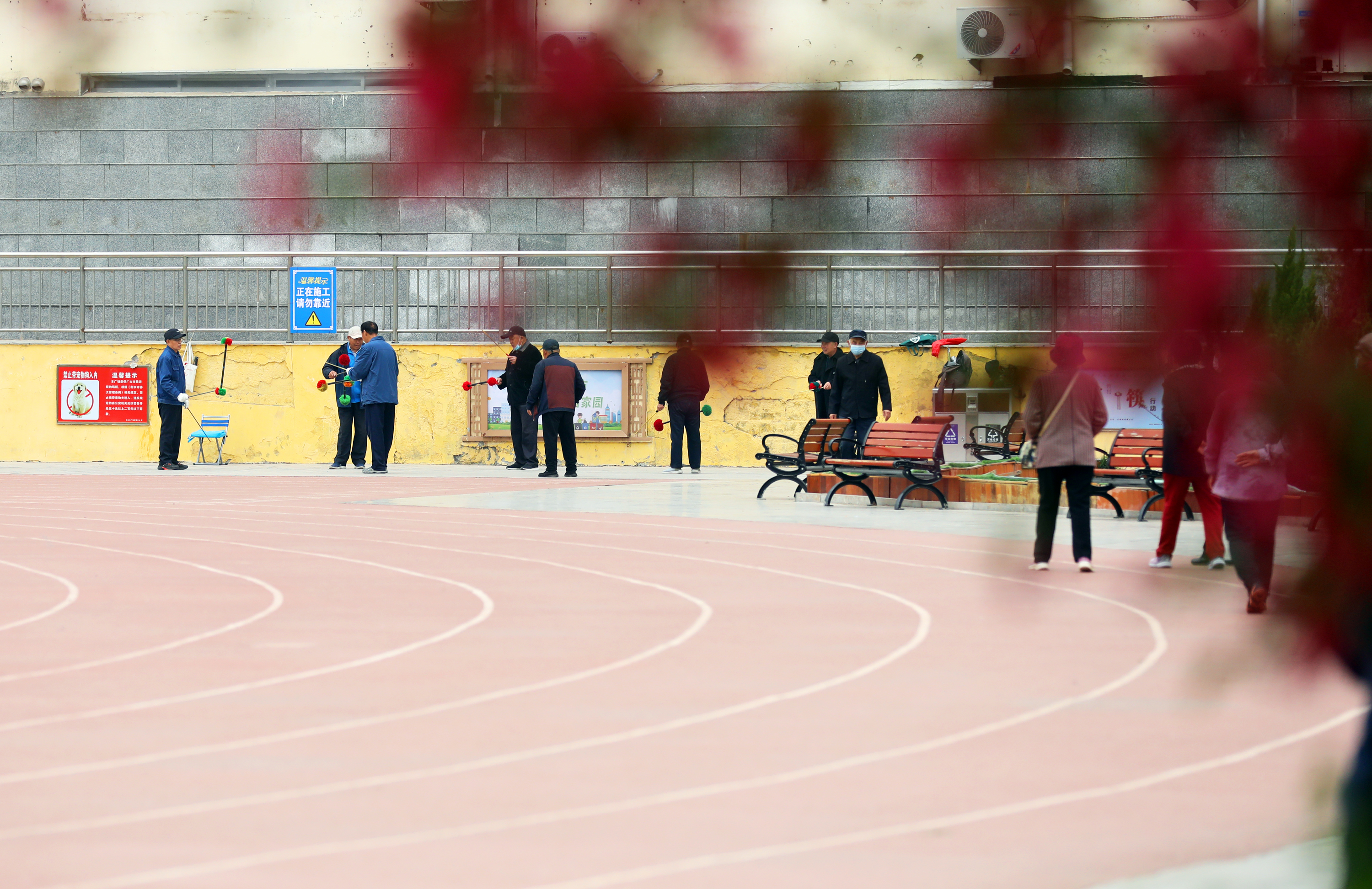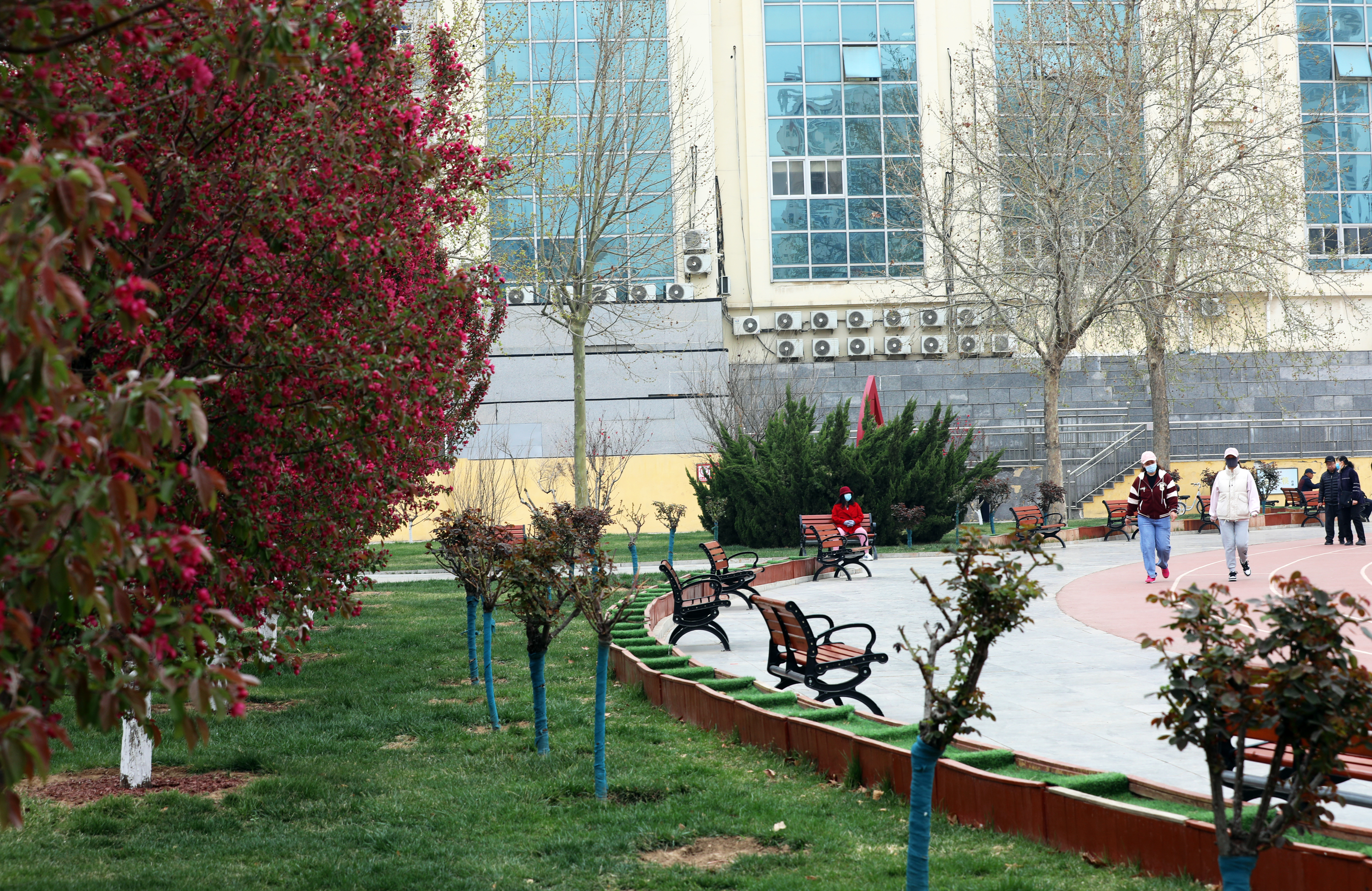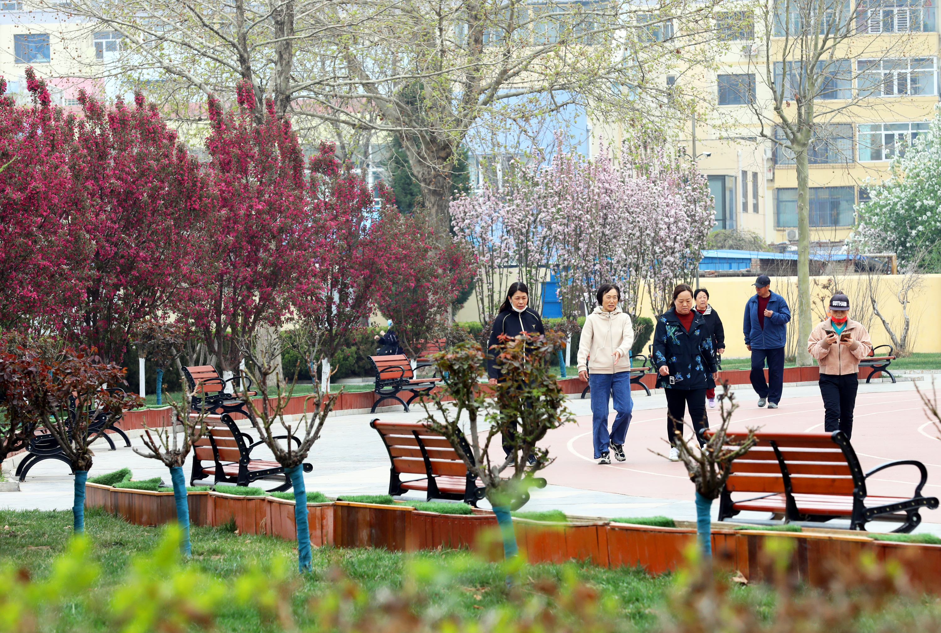 与三角绿地相隔数米的休闲广场,放眼望去,繁花遍布,粉白色的西府海棠花摇曳多姿,宛如翩翩起舞的仙子;满树红色的绚丽海棠妩媚娇俏,美得令人心醉神迷。市民在锻炼身体时尽情畅游于花海间,享受大自然赋予的美丽。