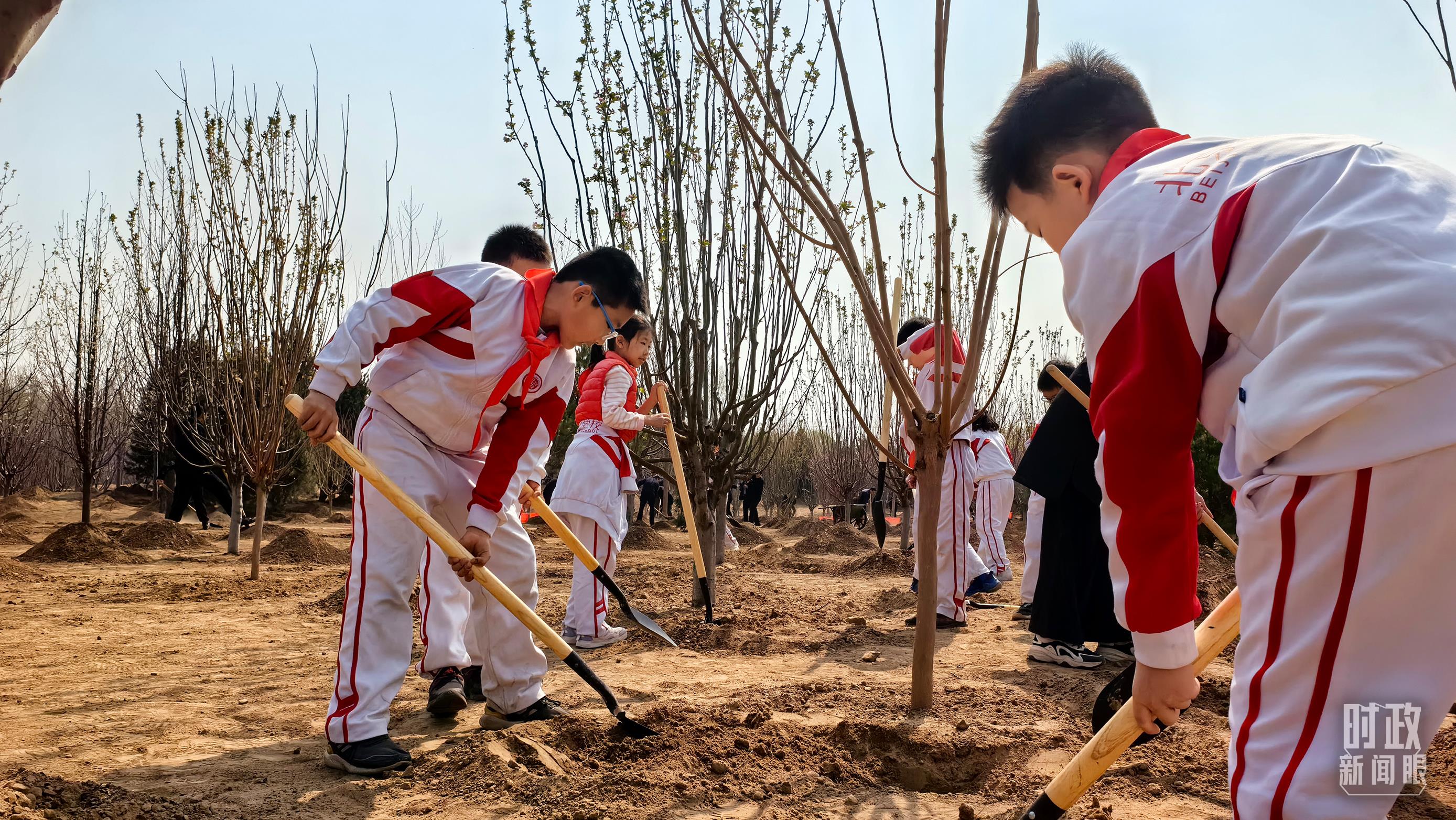 挥锹铲土、培土围堰、提水浇灌……习近平接连种下油松、黄栌、元宝枫、樱桃、红叶碧桃、侧柏等多棵树苗。习近平一边植树,一边询问孩子们的学习生活、劳动锻炼情况。他强调,广大青少年是祖国的未来,从小要积极参加劳动、植树造林,把绿色的种子种进心里,养成尊重自然、热爱自然的意识,勤奋学习、锻炼身体、茁壮成长,德智体美劳全面发展,努力成为国家栋梁。植树现场一派热火朝天的劳动景象,领导同志们同大家一起培土浇水,气氛热烈。