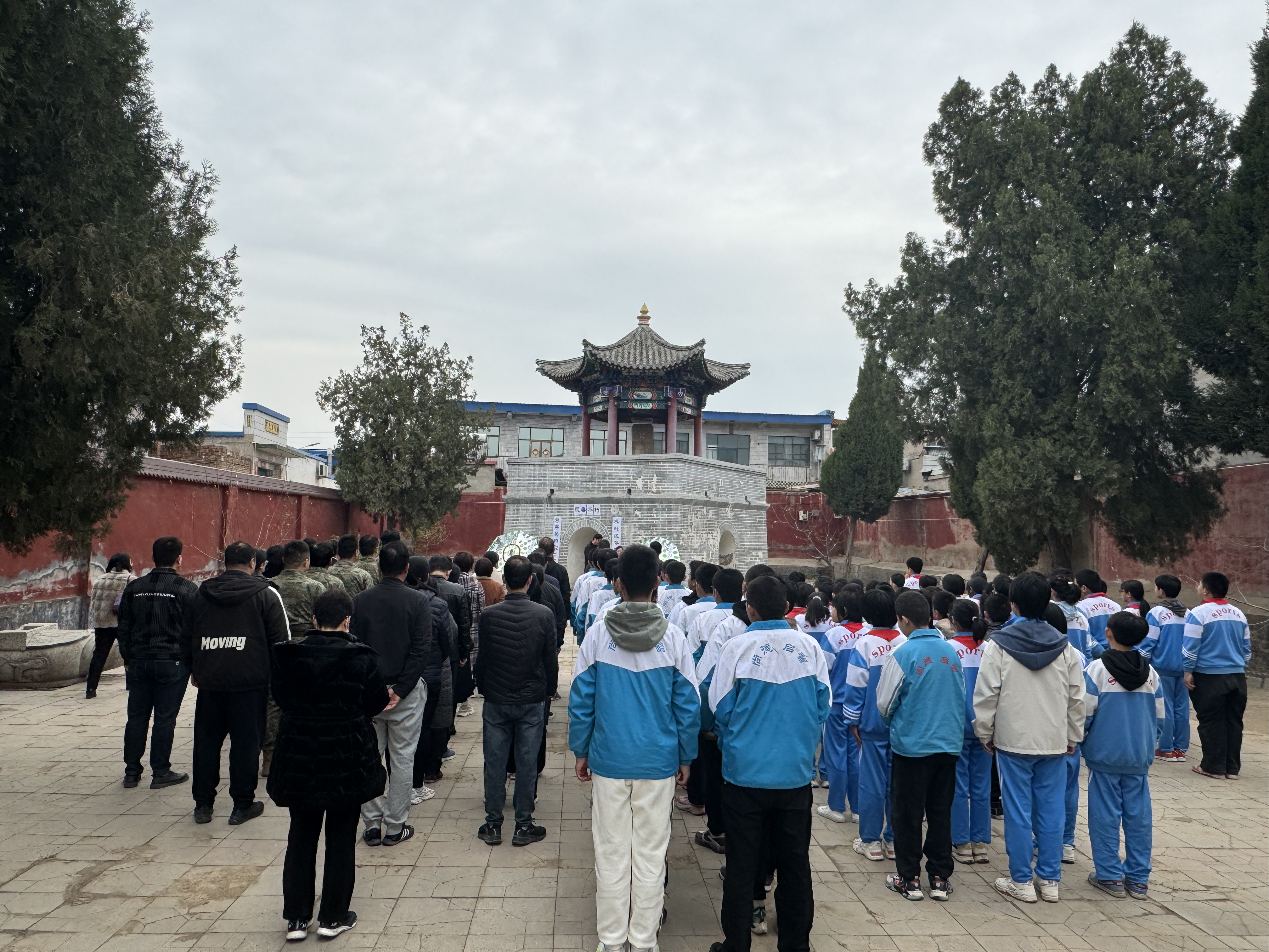 当天上午,在庄严肃穆的烈士纪念亭前,伴随着雄浑高亢的旋律,全体人员列队肃立,齐声高唱国歌。随后饱含敬仰之情向英勇献身的革命烈士垂首默哀、行鞠躬礼。默哀毕,大家依次走向纪念亭,献上手中的鮮花,并认真清扫周围的落叶、枯枝,表达对英烈的深切哀思和崇高敬意。