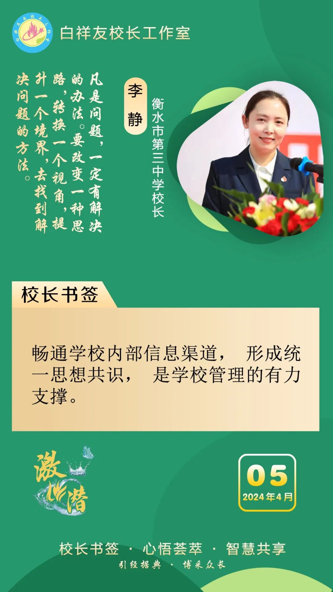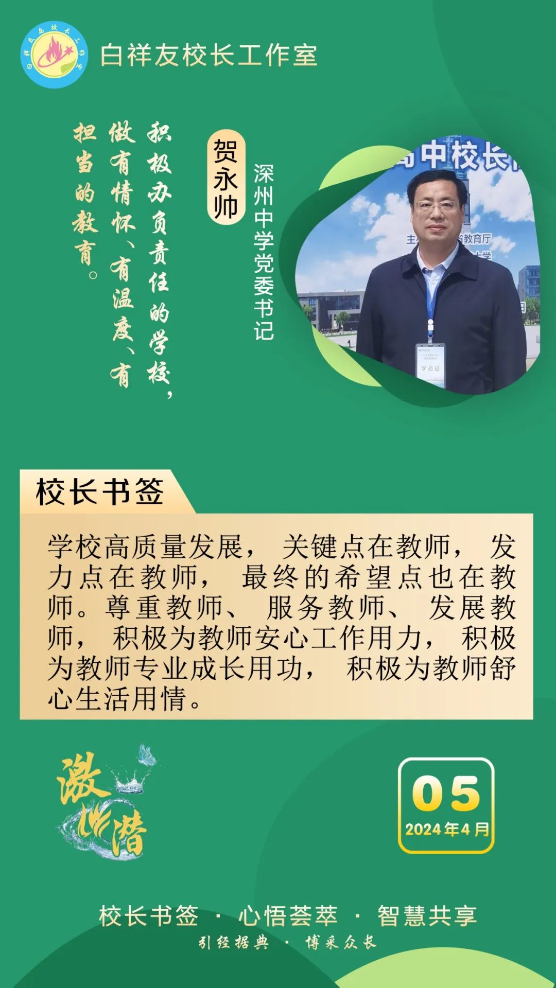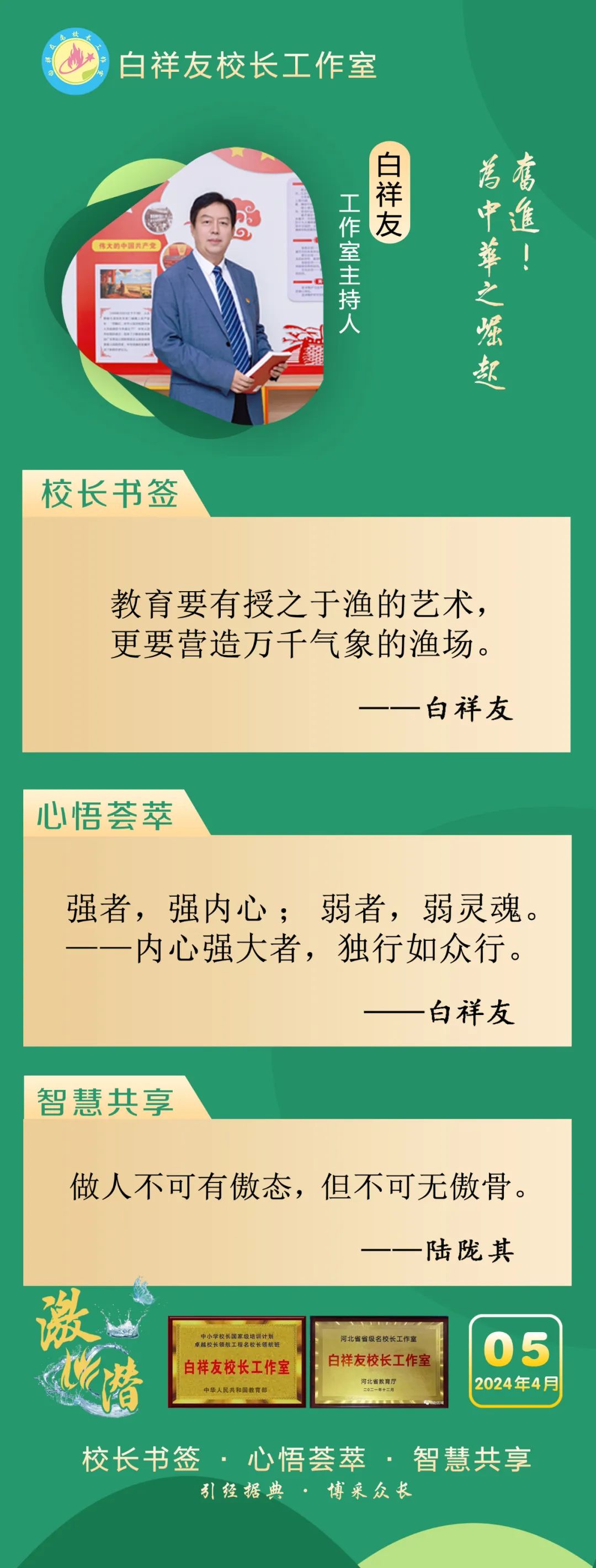 “白祥友校长工作室”成立于2019年4月,是教育部“国培计划”中小学名校长领航工程、河北省首批名校长工作室,目前省内外成员校20个。工作室坚持“资源共享、智慧共融、互助共赢”理念,已成为思想碰撞的交流场,资源共享的品牌站,成果展示的辐射源。 点赞 +1 微博 微信 我要评论 发布 相关推荐 白祥友名校长工作室 | 激潜教育探索随笔(第777期) 教育大观 2天前 白祥友名校长工作室 | 激潜教育探索随笔(第776期) 教育大观 3天前 白祥友名校长工作室 | 激潜教育探索随笔(第775期) 教育大观 3天前 白祥友名校长工作室 | 激潜教育探索随笔(第774期) 教育大观 4天前 白祥友名校长工作室 | 激潜教育探索随笔(第773期) 教育大观 4天前 白祥友名校长工作室 | 激潜教育探索随笔(第772期) 教育大观 4天前 白祥友名校长工作室 | 激潜教育探索随笔(第771期) 教育大观 4天前 热门 一天 三天 一周 1 壹视界·总书记两会“下团组”|健康中国怎么建?总书记这样强调 2 建行武邑支行:创新金融服务 赋能科技企业升级发展 3 新思想引领新征程丨牢记嘱托 团结奋斗 奋力开创中国式现代化建设新局面 4 工行枣强支行"科创贷"精准赋能 助企实现“科技变现” 5 微视频|新程之约 6 践行社会主义核心价值观|市文广旅局开展"竹编风铃挂饰”爱国主题实践活动 7 工行安平支行开展"金融为民"志愿服务 暖心帮扶特殊群体 8 工行故城支行专精特新贷支持“小巨人”转型蝶变 9 习言道|总书记的两会足迹 10 工行阜城支行金融活水赋能医用包装企业“智造”升级 1 人勤春来早 春管正当时——衡水市扎实推进春季农业生产纪实 2 衡水:滏阳河畔春意浓 繁花似锦醉春风 3 一方小田园 “种”出新生活——衡水滨湖新区开心农场春管见闻 4 衡水市将于4月初开展残疾人运动员选拔工作 5 衡水市启动社会救助兜底保障集中核查工作 6 衡水市区326座公交站亭集中“美容” 7 衡水市区宝云公园:修剪养护已完工 静待花开映日红 8 把“最活跃地带”打造成“最坚强阵地” 衡水以三大抓手破题新就业群体党建 9 衡水籍运动员米兰冬残奥会上再摘银! 王鹏耀获单板滑雪项目亚军 10 金融课堂开讲 楼道杂物清仓 ——中国农业银行衡水分行与桃城区河西街道广场社区党建共建签约记 1 “巾帼芳华 为爱赴约” 衡水市总工会举办青年职工相亲交友活动 2 政策宣讲 岗位对接 衡水市开展“春风行动”招聘会暨“情暖三八 社保护航”主题宣传活动 3 值班总编说报|春潮涌动千帆竞 实干争先万象新 4 一场制造业的“数字春雨”——衡水市景县优化营商环境一线探访 5 阜城县企业数字化转型培训会赋能产业转型升级 6 守护安全 畅通消费 衡水市2026年“3·15国际消费者权益日”系列活动启动 7 人勤春来早 春管正当时——衡水市扎实推进春季农业生产纪实 8 “彩墨凝香——2026年衡水市女书画家精品展”开展 百余幅书画精品尽显女书画家艺术风采 9 起宏图!奋进“十五五”AI超燃大片来了 10 央媒省媒关注全国两会中的“衡水声音” 广告 广告 广告 24小时 1 锚定绿色方向,打造“绿电粮仓”,张家口全力推进国家级可再生能源示范区建设 2 “最美自然守护者”王贵玲:把脉大地热源 深耕绿能未来 3 感恩奋进 双争有我丨燕山大学材料科学与工程学院:硬核科研 温暖育人 4 定州:万象“耕”新不负春 5 冀时新闻主播说丨让“放心消费”成为燕赵新名片 6 共享智造“县”在时丨高阳小毛巾,织出高质量发展崭新纹理! 7 “3·15”国际消费者权益日·长图|见招拆招!这份“避坑指南”快收好 8 学习新语·两会|奋进,在接力跑的新起点 9 微视频|共议家国事 10 2026年“金融3·15”特别报道|中华财险衡水中心支公司:聚焦保险主业 服务保障民生