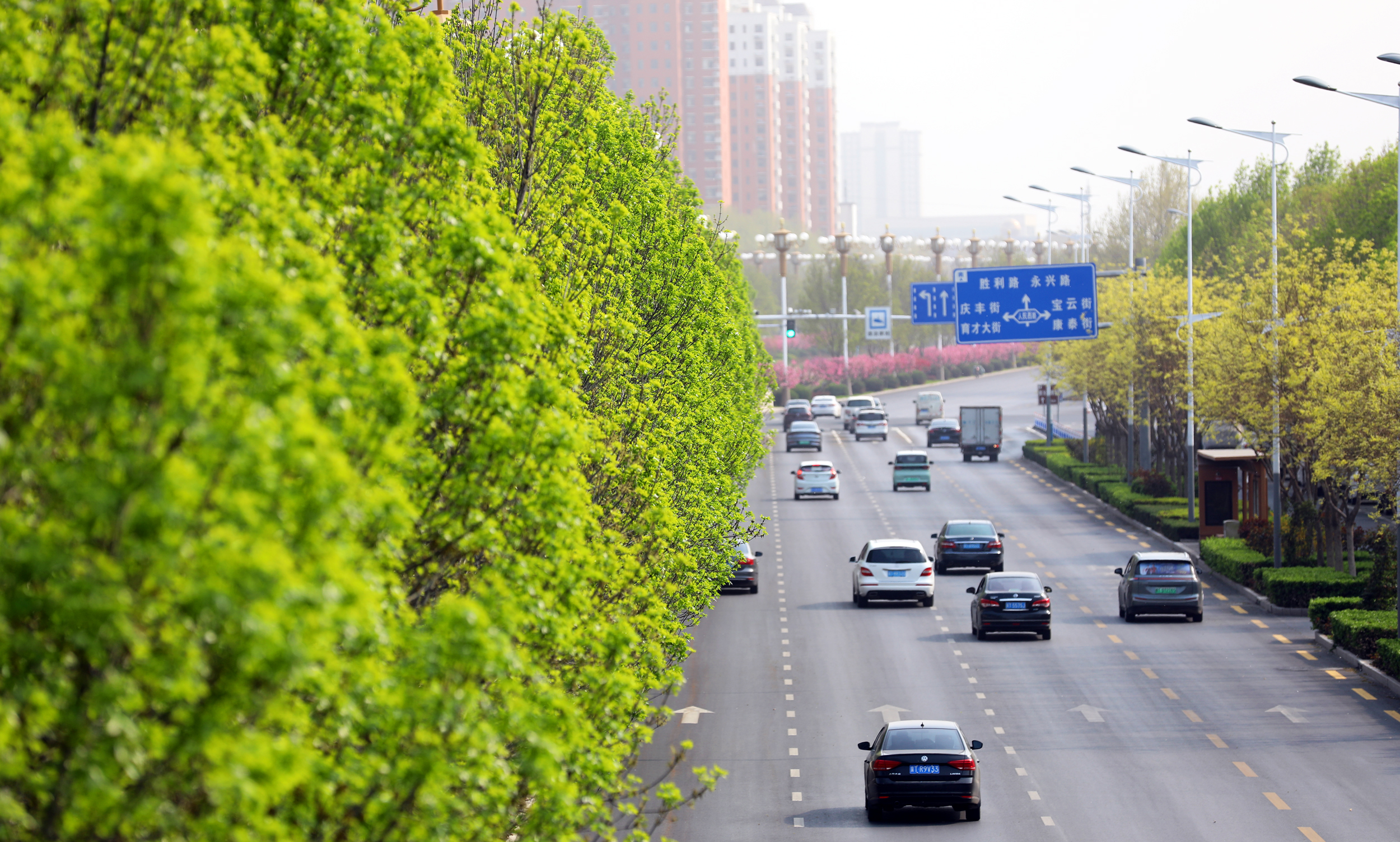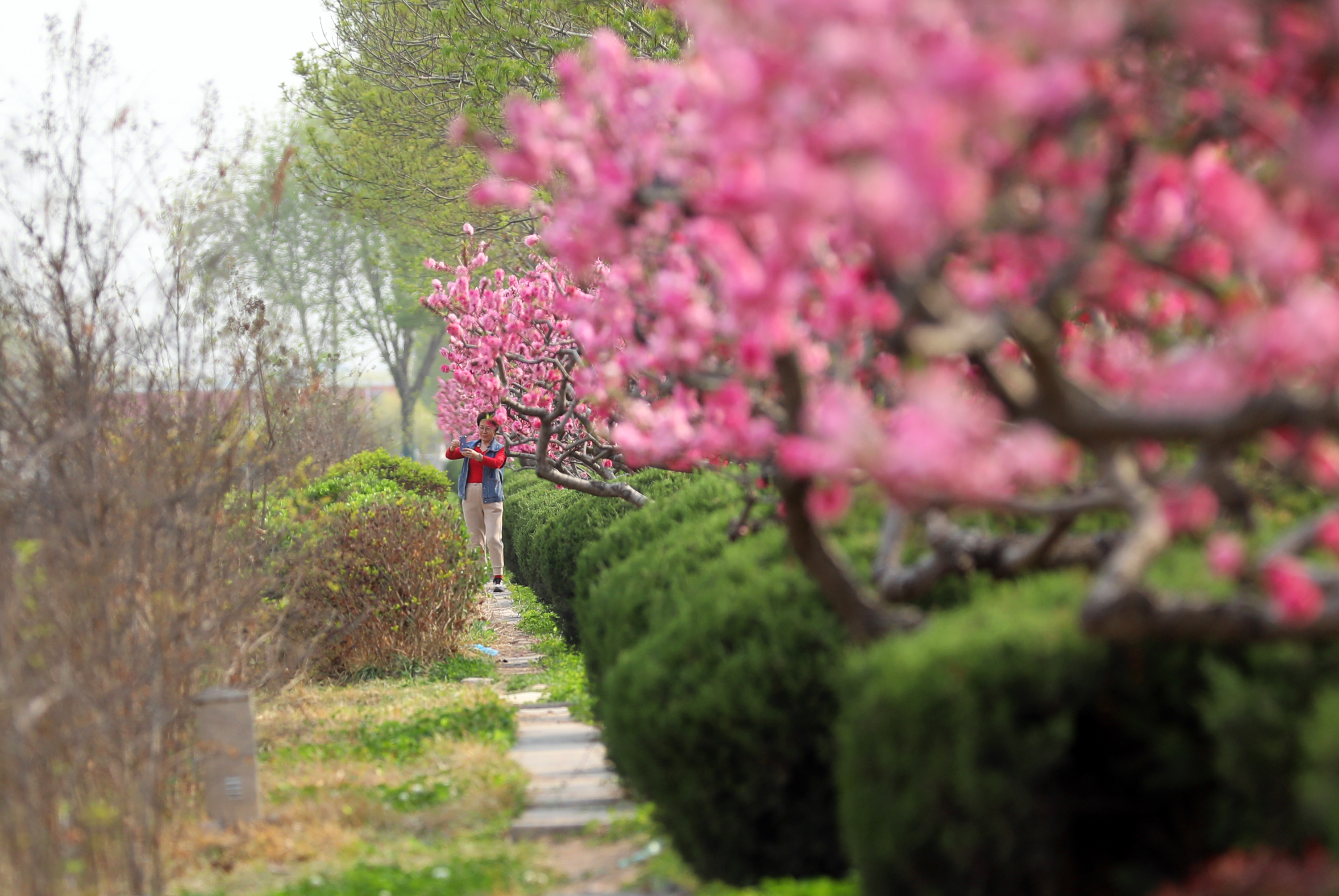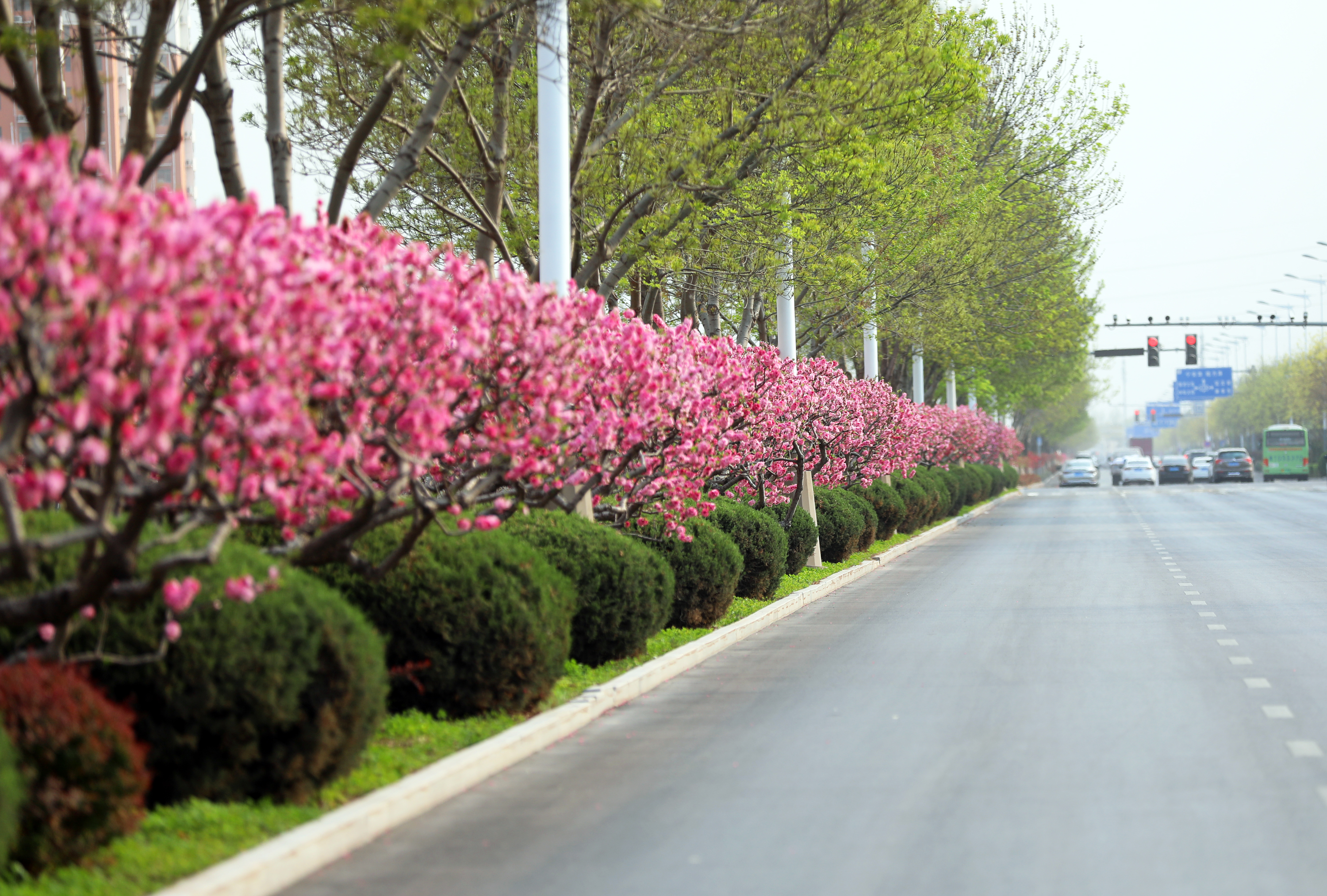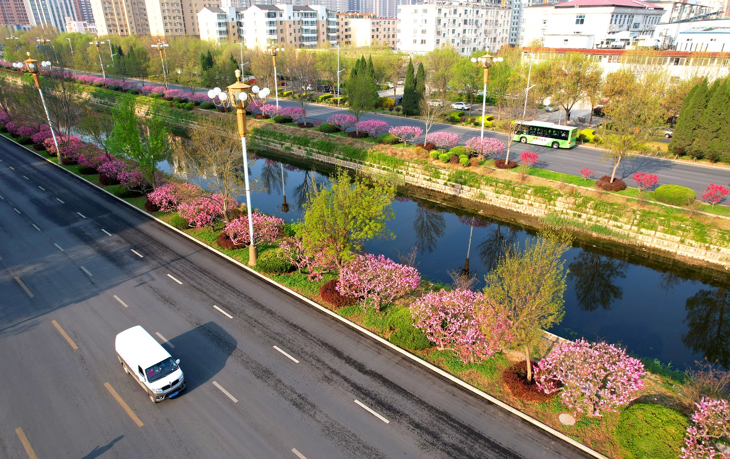 站在前进大街天桥处,映入眼帘的是一排排绿意盎然的白蜡树、色彩鲜艳的碧桃花,给人留下深刻的印象。碧桃树上鲜花一簇簇、一朵朵,挤满枝头,红的似火,粉的似霞,每一朵都散发着独特的魅力,令人目不暇接。市民徜徉在桃花间或闻着醉人的清香,或与娇媚的桃花一起合影留念,乐享春日好时光。