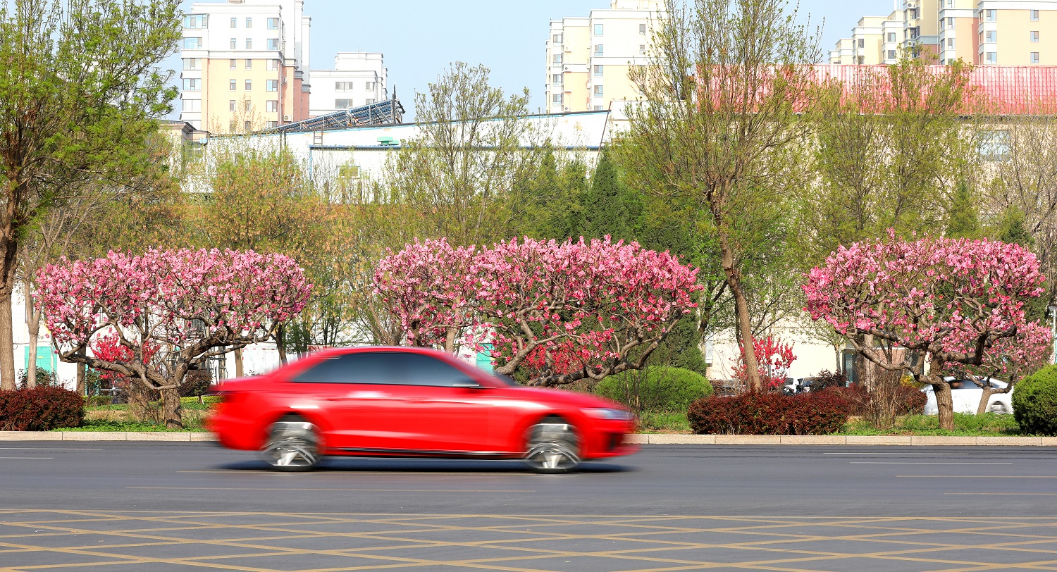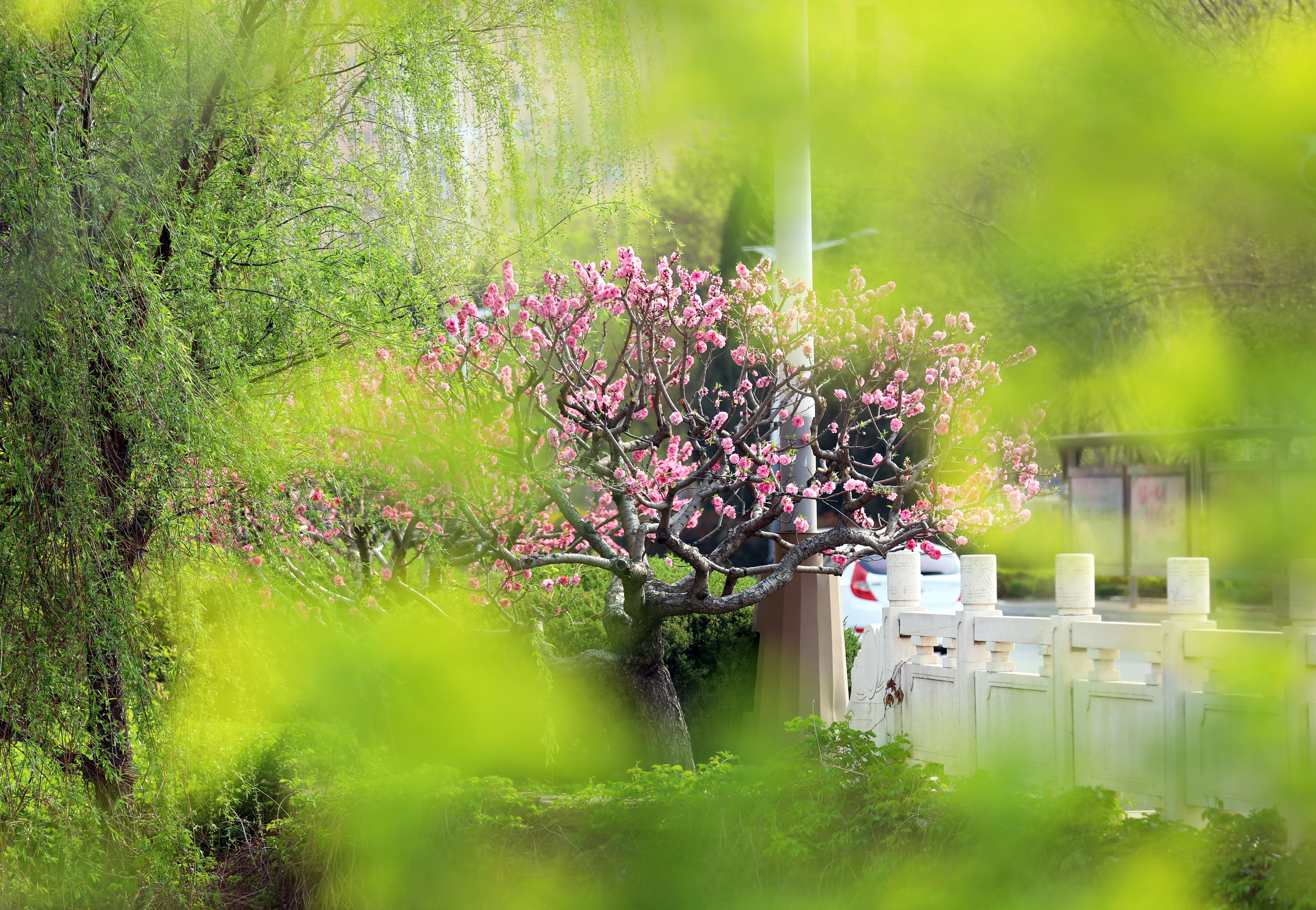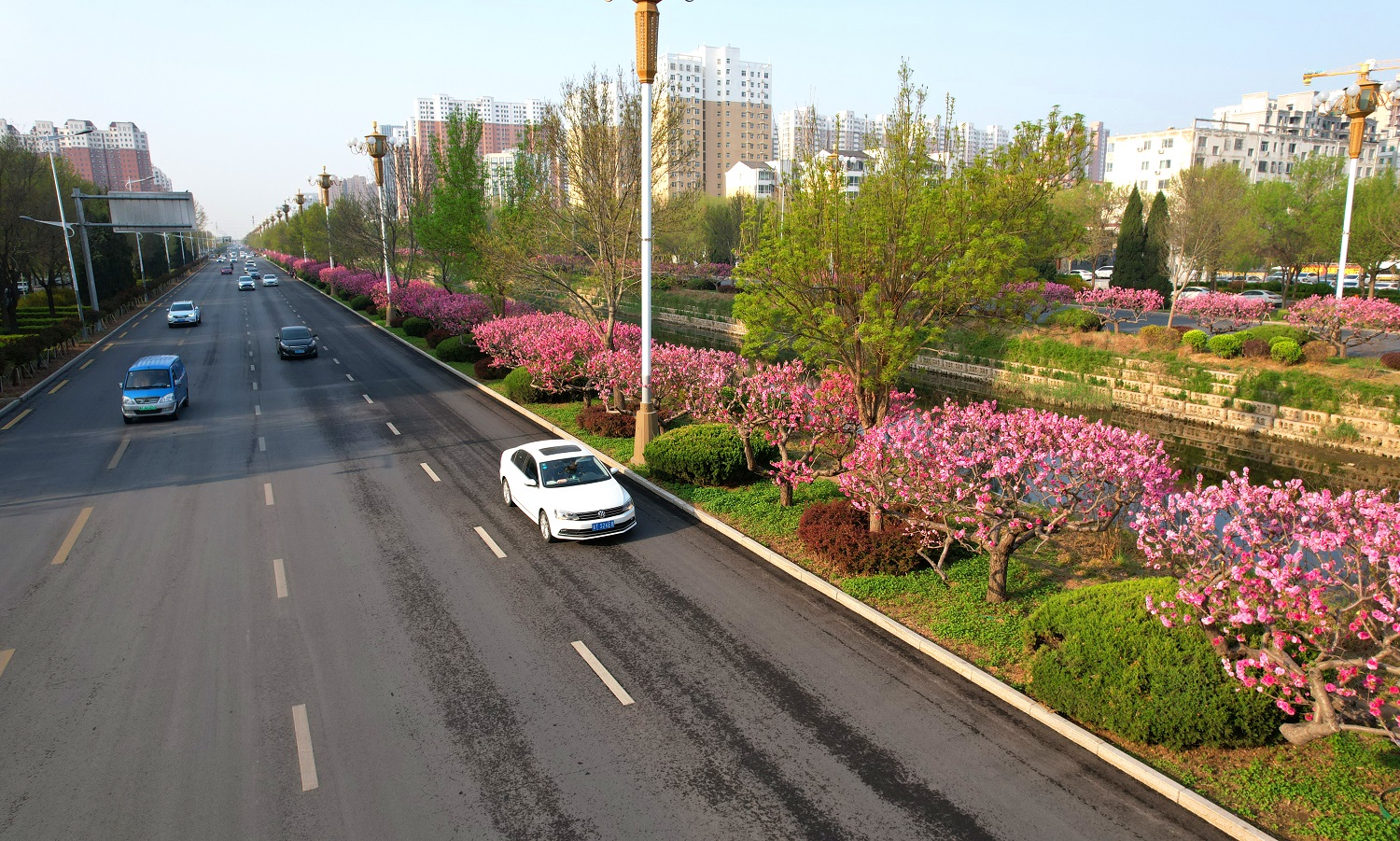 站在前进大街天桥处,映入眼帘的是一排排绿意盎然的白蜡树、色彩鲜艳的碧桃花,给人留下深刻的印象。碧桃树上鲜花一簇簇、一朵朵,挤满枝头,红的似火,粉的似霞,每一朵都散发着独特的魅力,令人目不暇接。市民徜徉在桃花间或闻着醉人的清香,或与娇媚的桃花一起合影留念,乐享春日好时光。